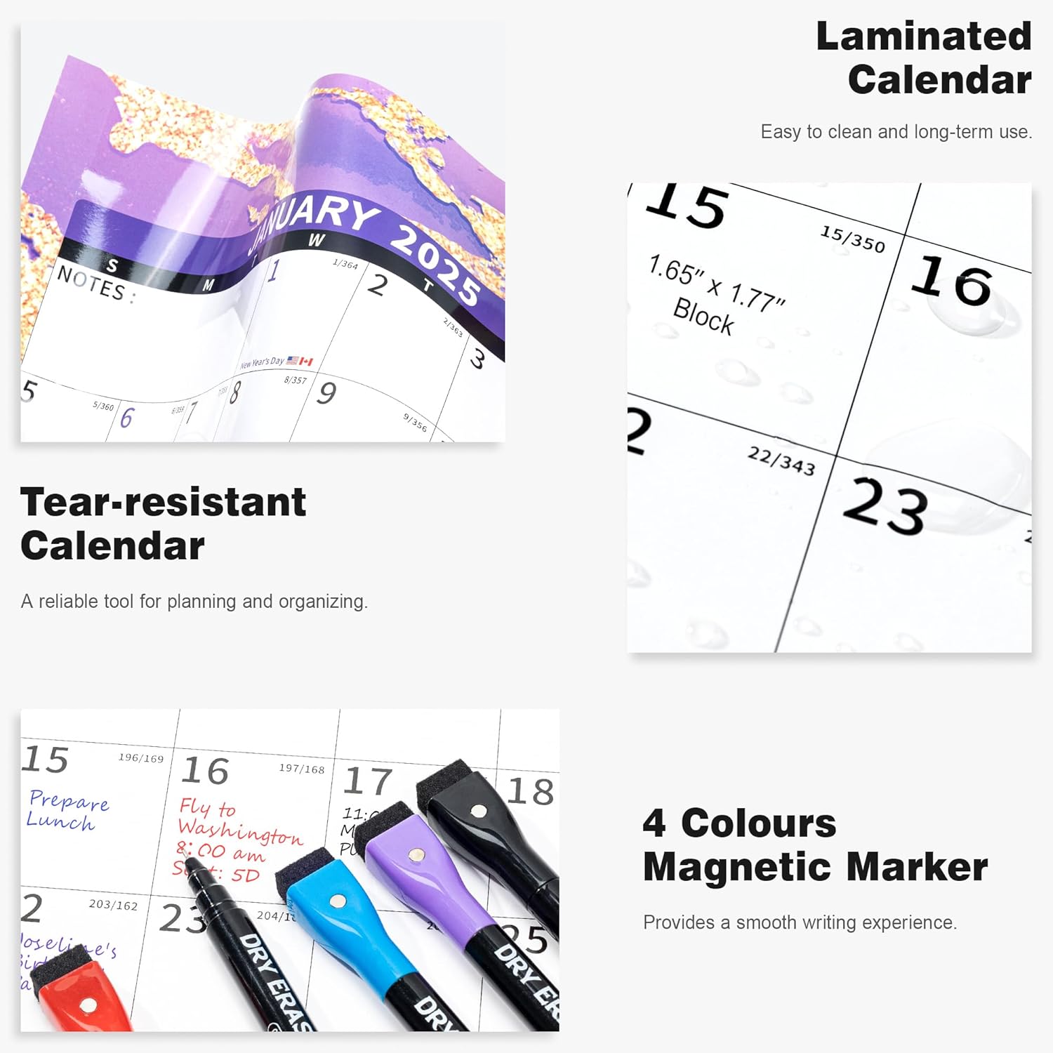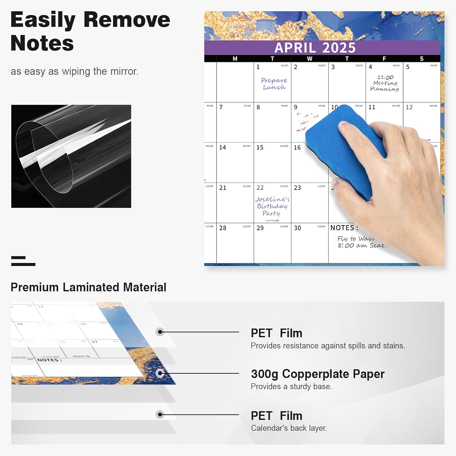- ✨ Dry Erase Wall Calendar : is made of PET Film and 300 grams Copperplate Paper, providing a durable surface that resists scratches and smudges, while the sturdy Copperplate Paper backing keeps it in place without curling.