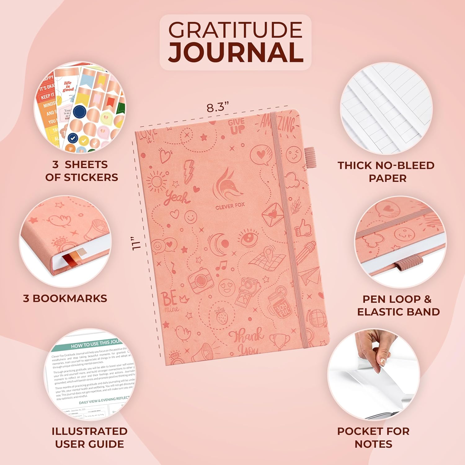 Clever Fox Gratitude Journal Large – Happiness, Positivity & Affirmation Journal – Inspirational Daily Notebook, 3 Months, 8.3x11” (Peach Pink)