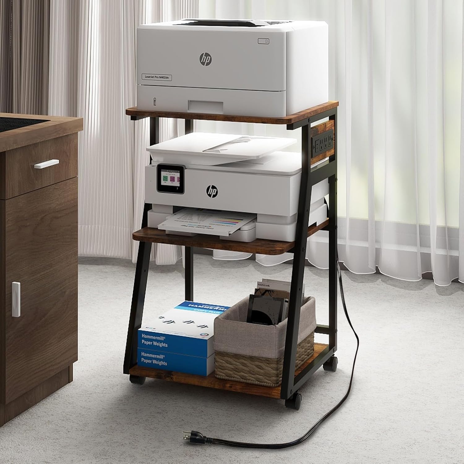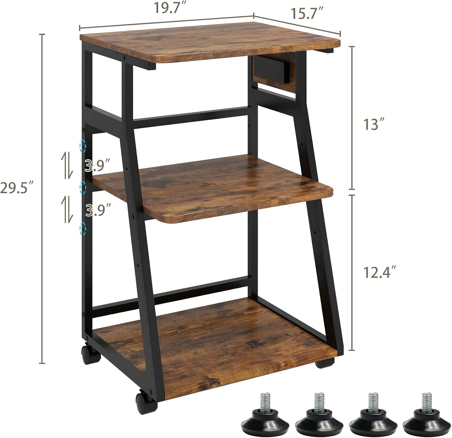 Natwind 19.7"x15.7" Printer Stand,3 Tier Printer Table with Charging Station, Rolling Cart with Adjustable Storage Shelf for Home Office Organization, Stand for Heat Press,3D Printer (Retro)