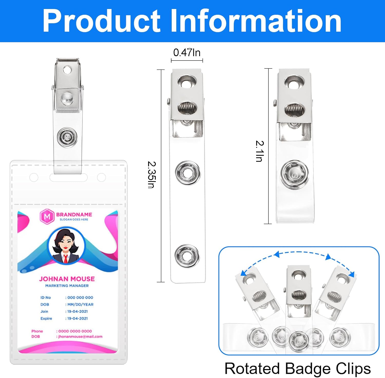 - Easy to use: The ID badge clips can be rotated 360 degrees, easy to open and close. Can be fasten on clothes, bags, badge reels, etc., The metal clips have 2 holes that are pre punched, which help you to hang or clip the holder in a variety of ways