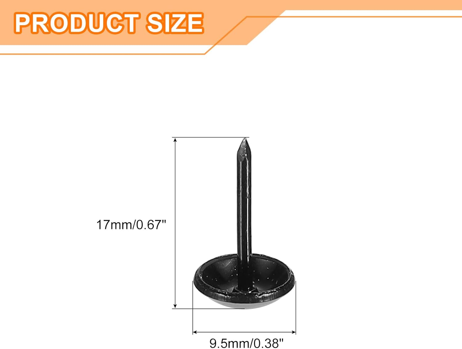 - Specifications: Material: Carbon steel; Color: Black; Diameter of nails head: 9.5mm/0.38inch; Shank length: 17mm/0.67inch; Package Content: 250Pcs x Upholstery Tacks Nail Pins