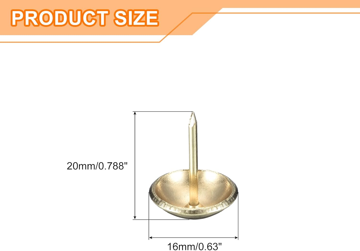 - Specifications: Material: Carbon steel; Color: Gold; Diameter of nails head: 16mm/0.63inch; Shank length: 20mm/0.788inch; Package Content: 100Pcs x Upholstery Tacks Nail Pins