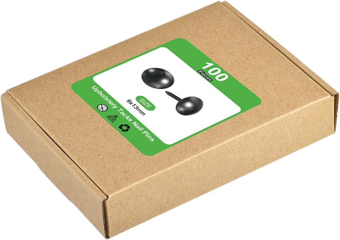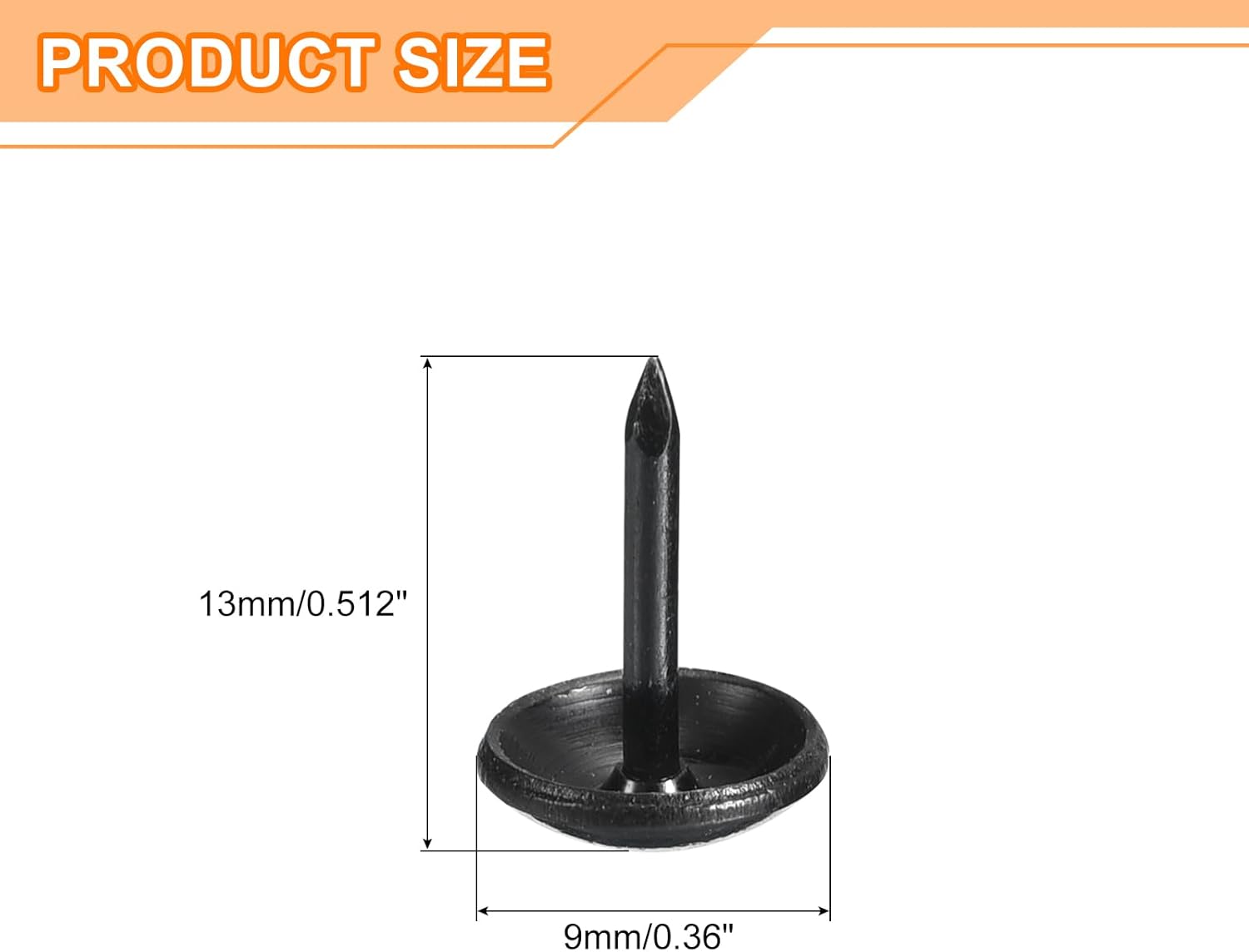 - Specifications: Material: Carbon steel; Color: Black; Diameter of nails head: 9mm/0.36inch; Shank length: 13mm/0.512inch; Package Content: 100Pcs x Upholstery Tacks Nail Pins