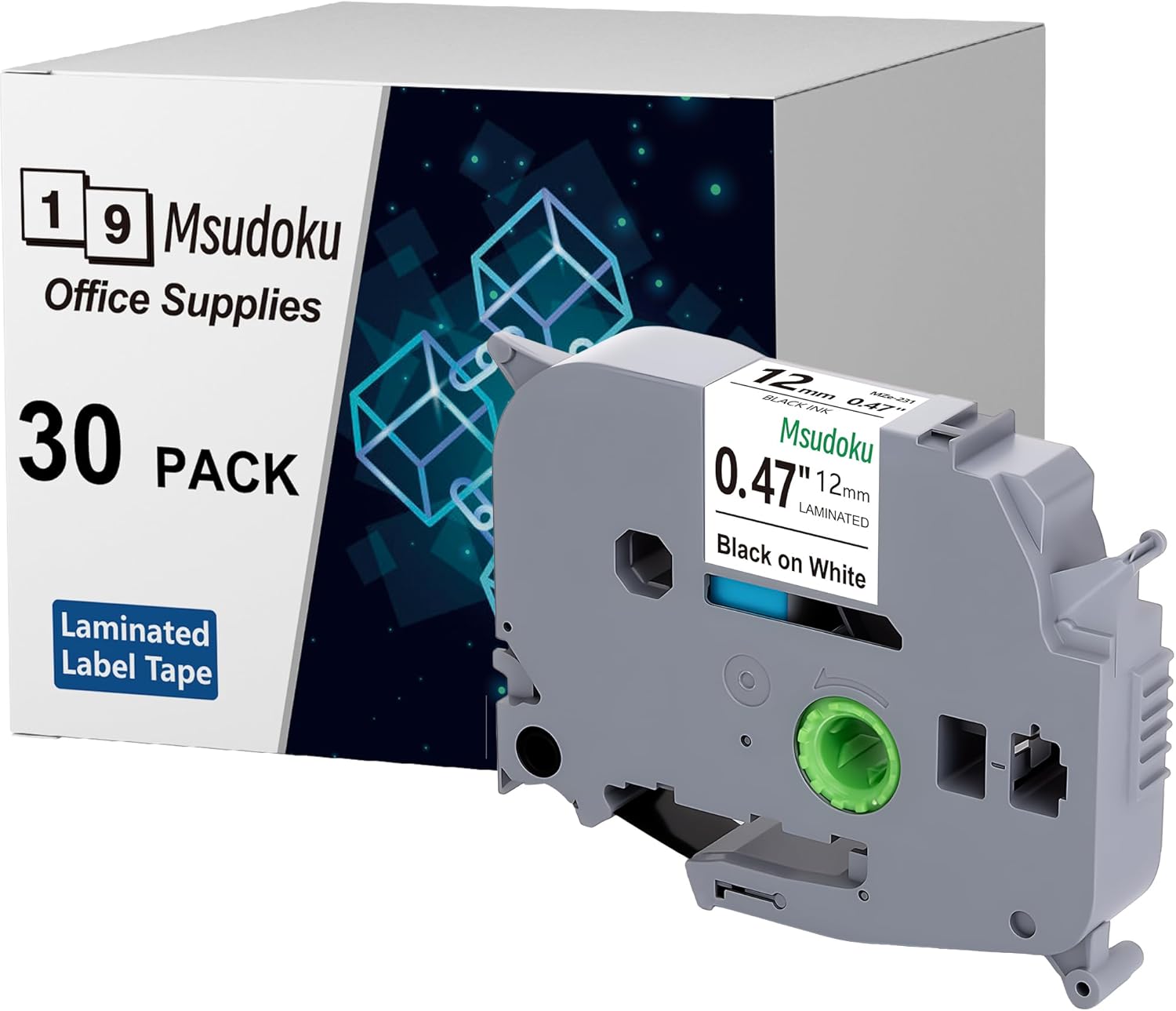 Tze TZ Tape 12mm 0.47 Laminated White Compatible for Brother Label Maker Tape 12mm 1/2" Black on White for Ptouch PT PTD200 PTD410 D210 D220 D610 P710BT PTH110, 30-Pack