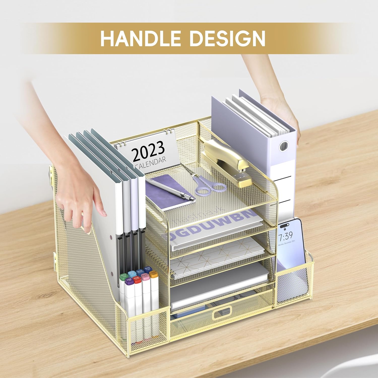 SUPEASY Mesh Desk Organizer with File Holder, 5-Tier Paper Letter Tray Organizer with Magazine Holder, Desktop Organizer and Storage with Drawer for Office Supplies Home or School, Gold