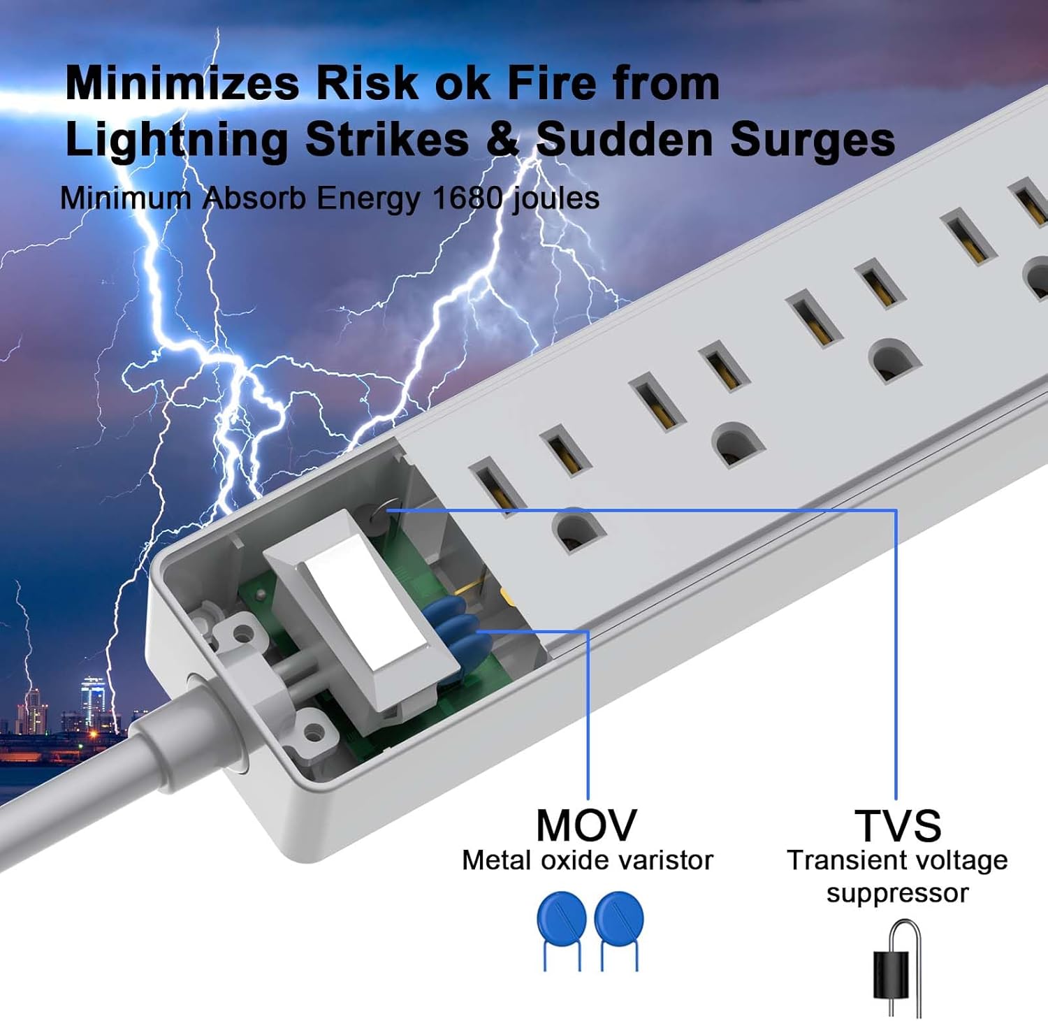 - Surge Protector outlet: The 6 AC outlets provide surge protector against electrical spikes. Two complementary Surge Protection Circuits, TVS (transient voltage clamp) MOV(metal oxide varistor), with response speed less than 1Ns, and minimum energy-absorbing capacity of 1680 Joules, its response time is much shorter than the single MOV surge protector circuit, It truly provides great protection of your precious plugged-in devices.