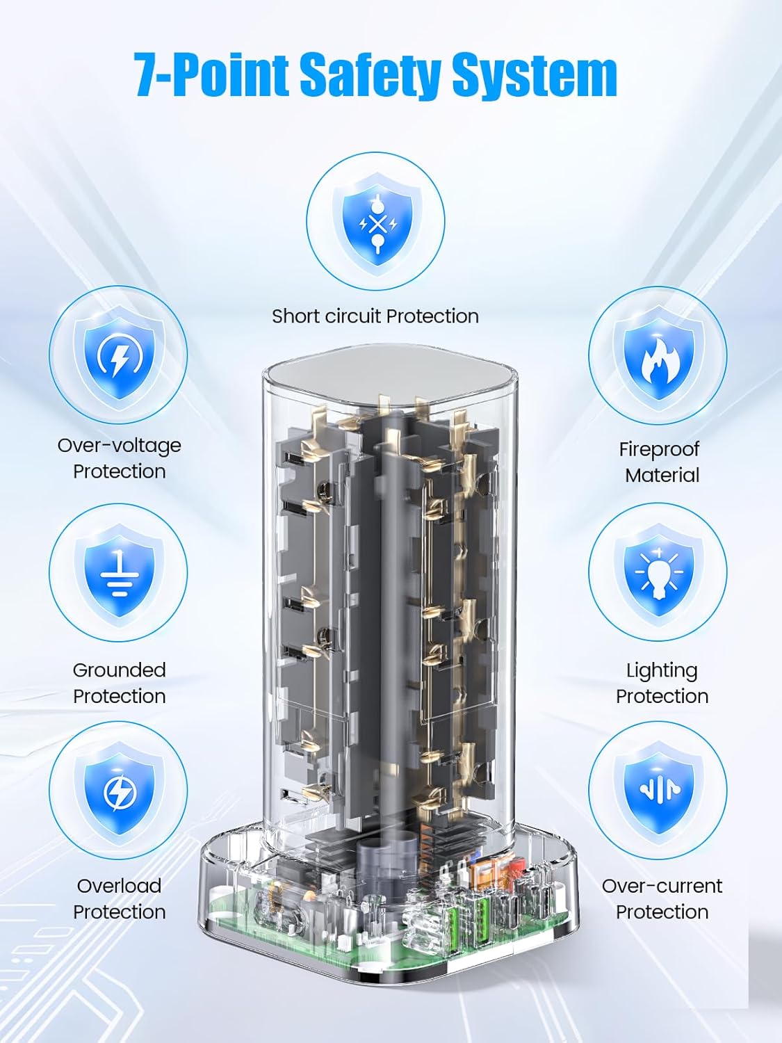 - 【Surge Protector Tower】With overload protection, short-circuit protection, and over-current protection, this device ensures your electronics stay safe. The dependable on/off switch automatically disconnects power, safeguarding your valuable devices and creating a secure charging space. Additionally, multilayer extension cords enhance safety and durability.