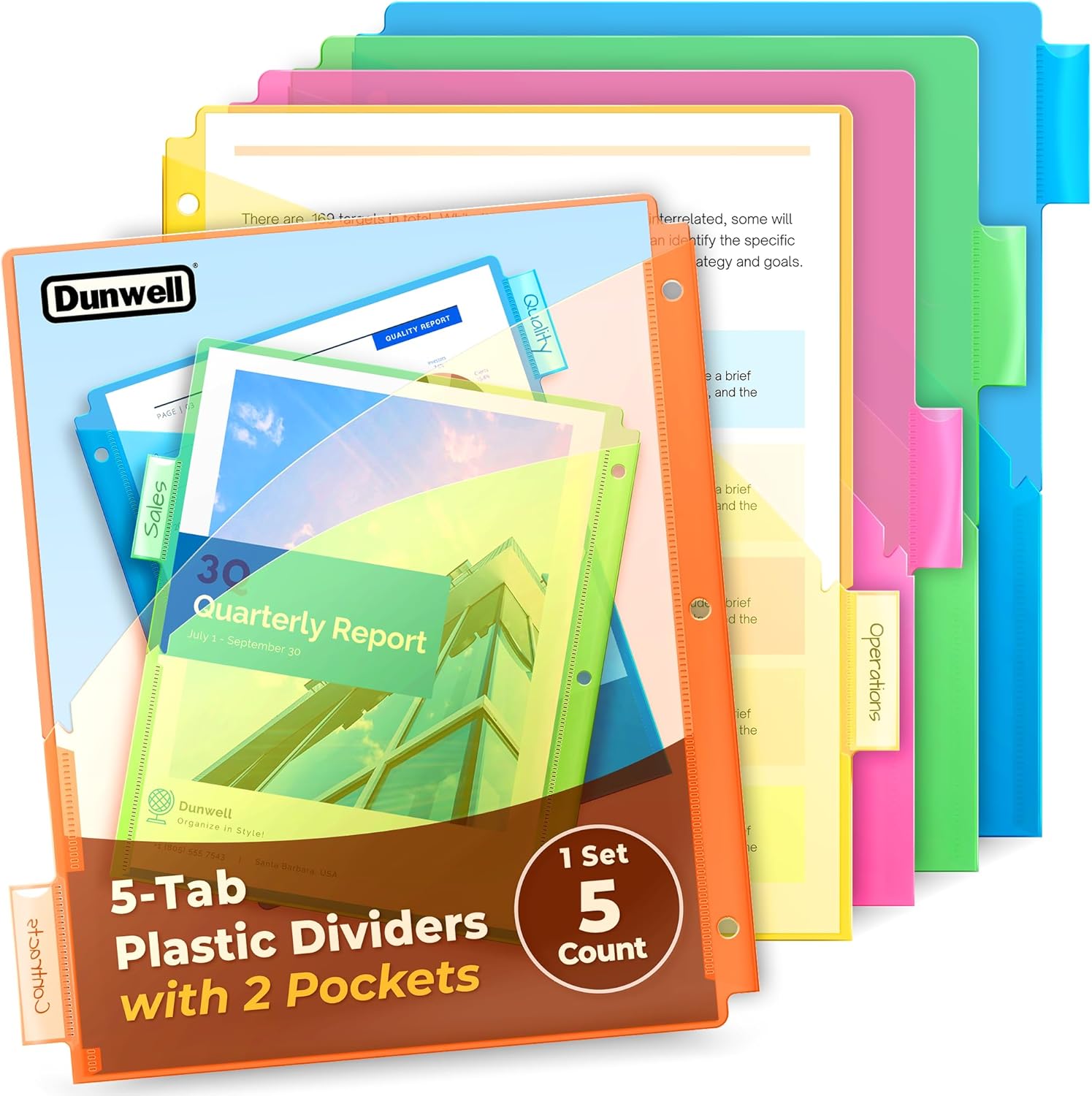 Dunwell 5-Tab Binder Pocket Dividers, Plastic Dividers with Two Pockets for 3-Ring Binder, Multicolor, Fits 8.5x11 Letter Size Documents, Insertable Tabs, 5 Subject Notebook Divider 3 Hole Punched