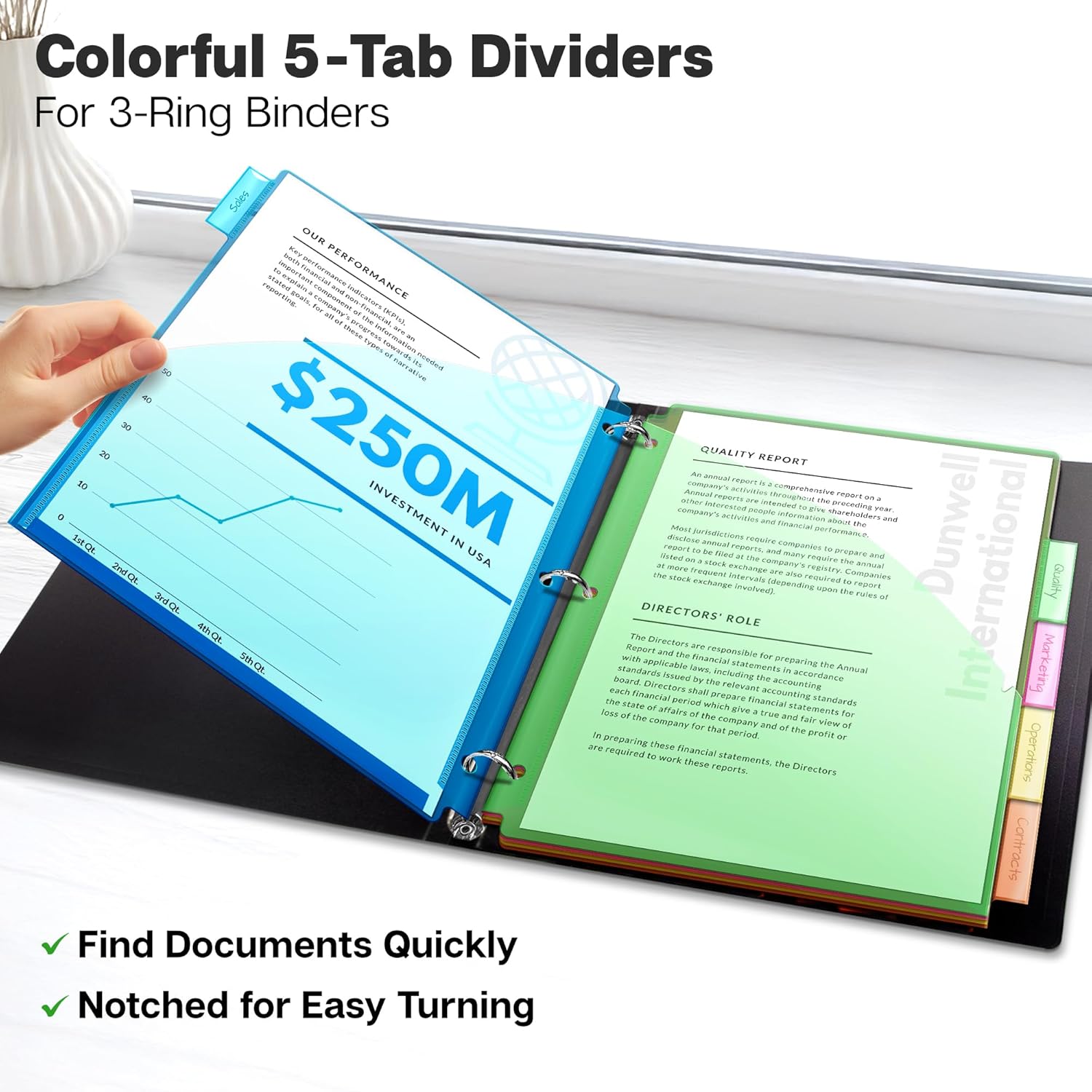 - Many Uses: Binder separators with 5 index tabs for quick reference and access, Great for office documents, school, personal papers, 3 ring dividers with 2 sided pockets.