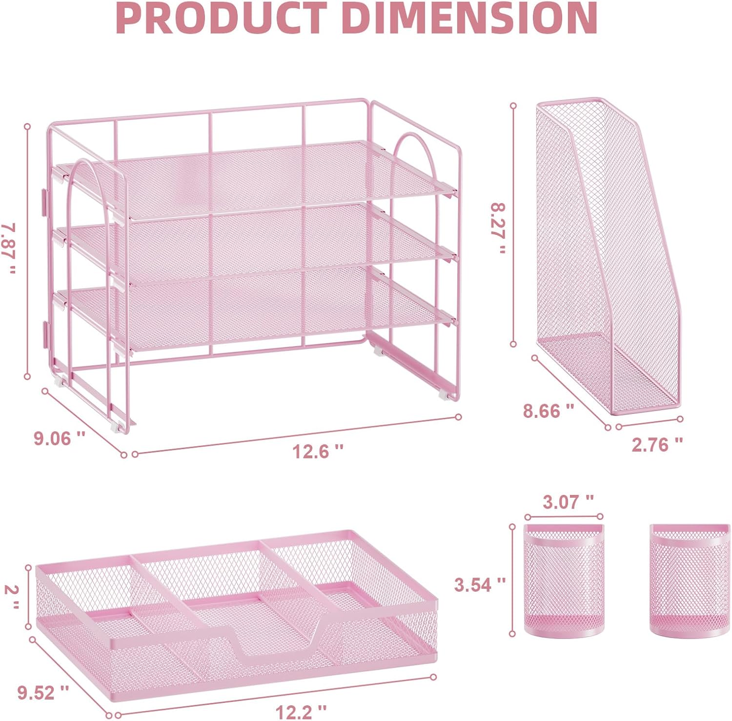 Marbrasse Desk Organizer and Accessories,4-Tier Paper Letter Tray Organizer with File Holder, Workspace Desk Organizers Accessories with Drawer and 2 Pen Holder (Pink, 15.4" x 9.1" x 8.3")