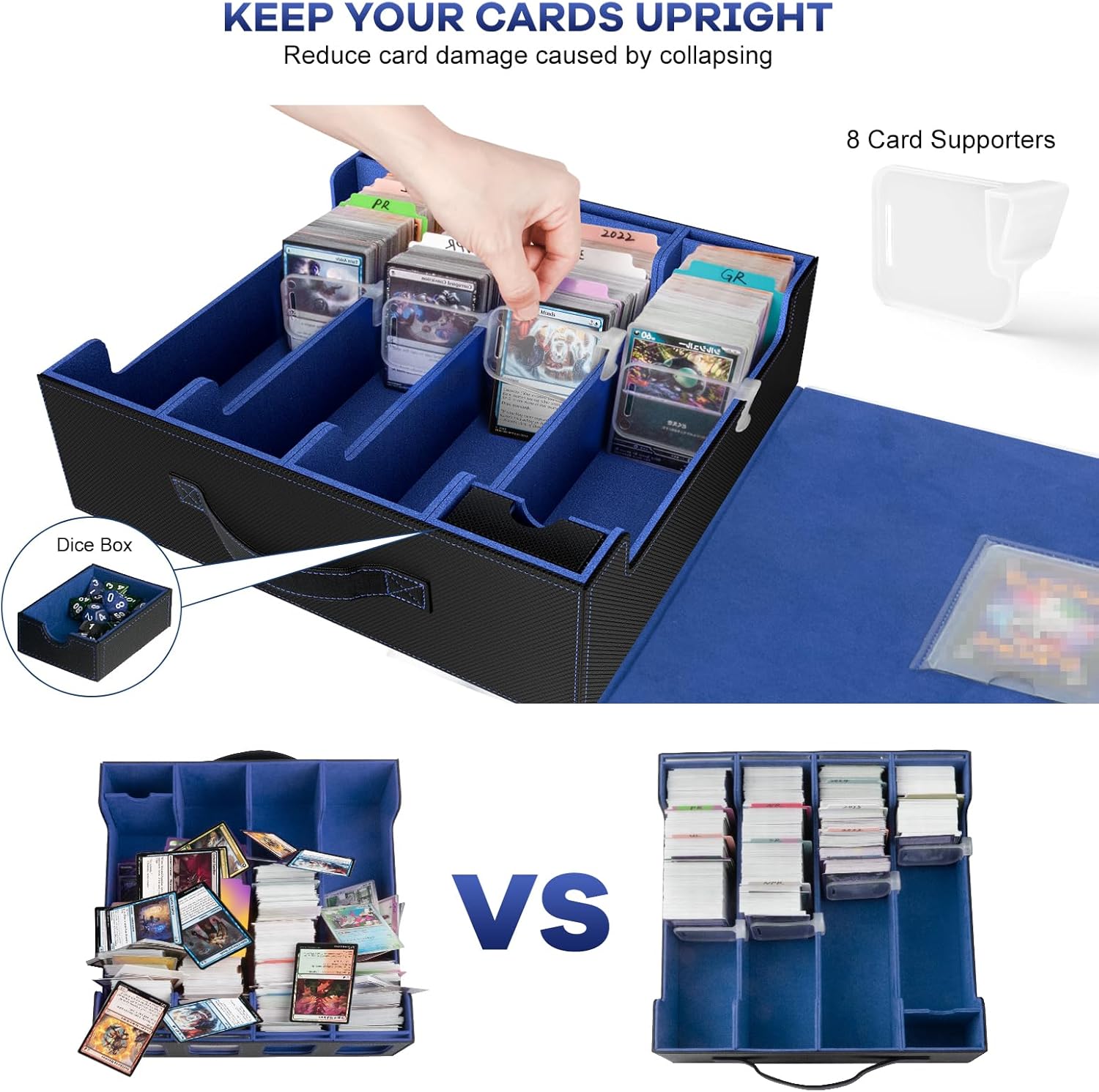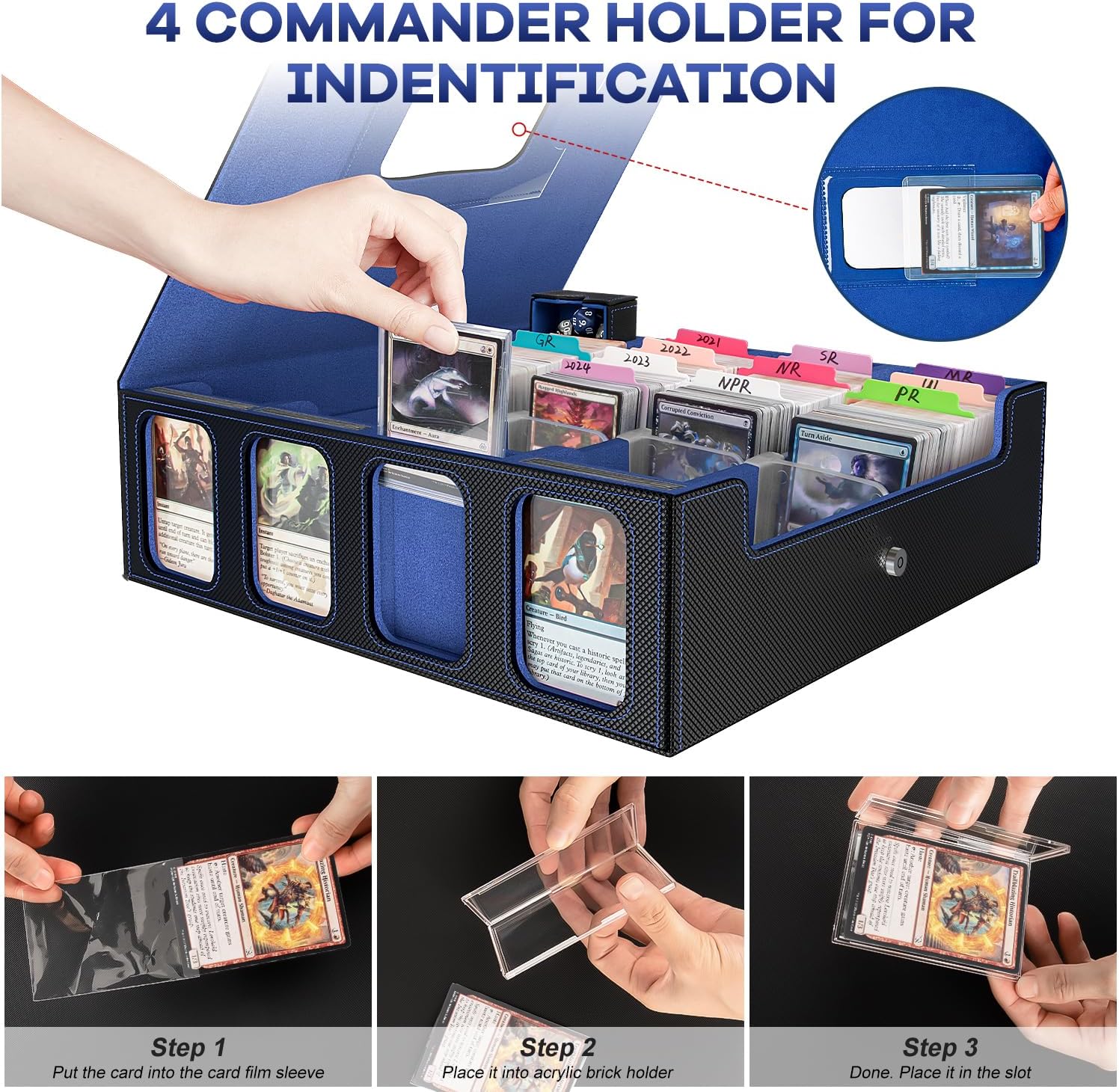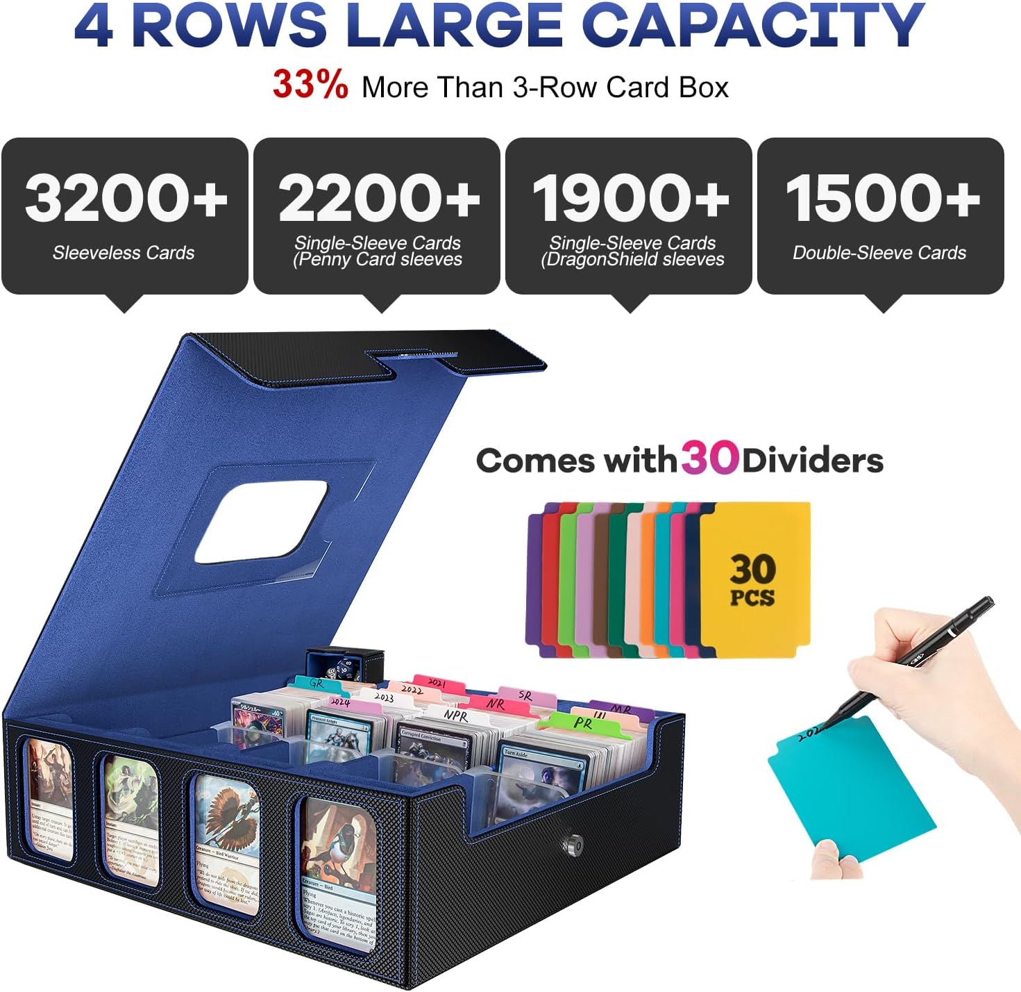 3200+ Trading Card Storage Box with Commander Display, 4-Row TCG Card Box with Portable Handle, Compatible for TCG/MTG/Magic Cards, 30 Colorful Divider, 8 Supporters, US Design Patent (Black&Blue)