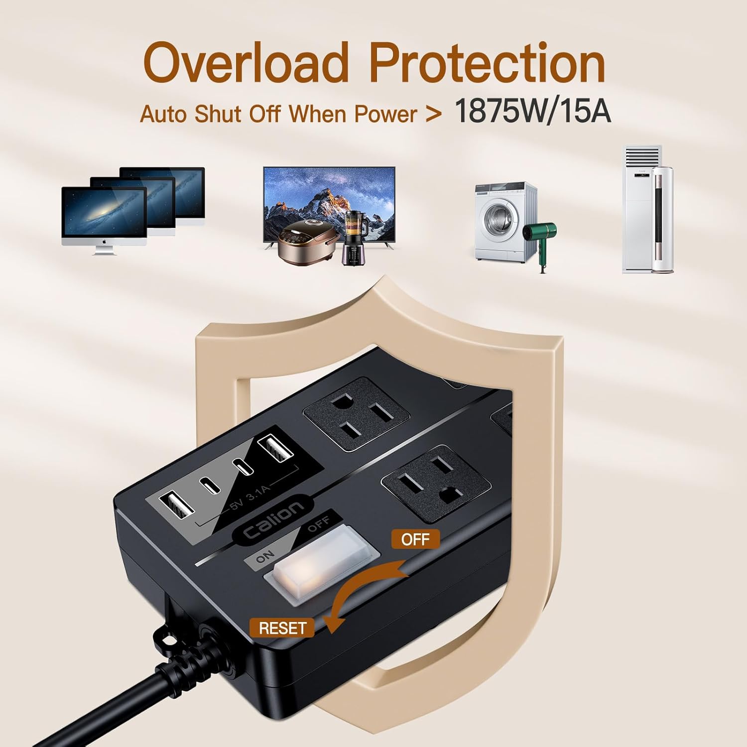 - 10 IN 1 USB-C Power Strip: Simplify your charging with this 15-foot power strip featuring 6 outlets, 2 USB-A, and 2 USB-C ports.Charge up to 10 devices simultaneously with 5V/3.1A/15.5W USB output. Compatible with most devices, it eliminates clutter and maximizes efficiency