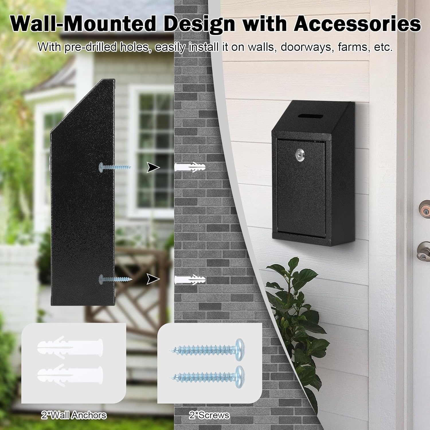KYODOLED Money Cash Drop Box Wall Mount with Key, Metal Donation and Suggestion Box with Slot and Lock for Home, Farm or Office, Black, 10.24 x 5.7 x 2.95 Inch