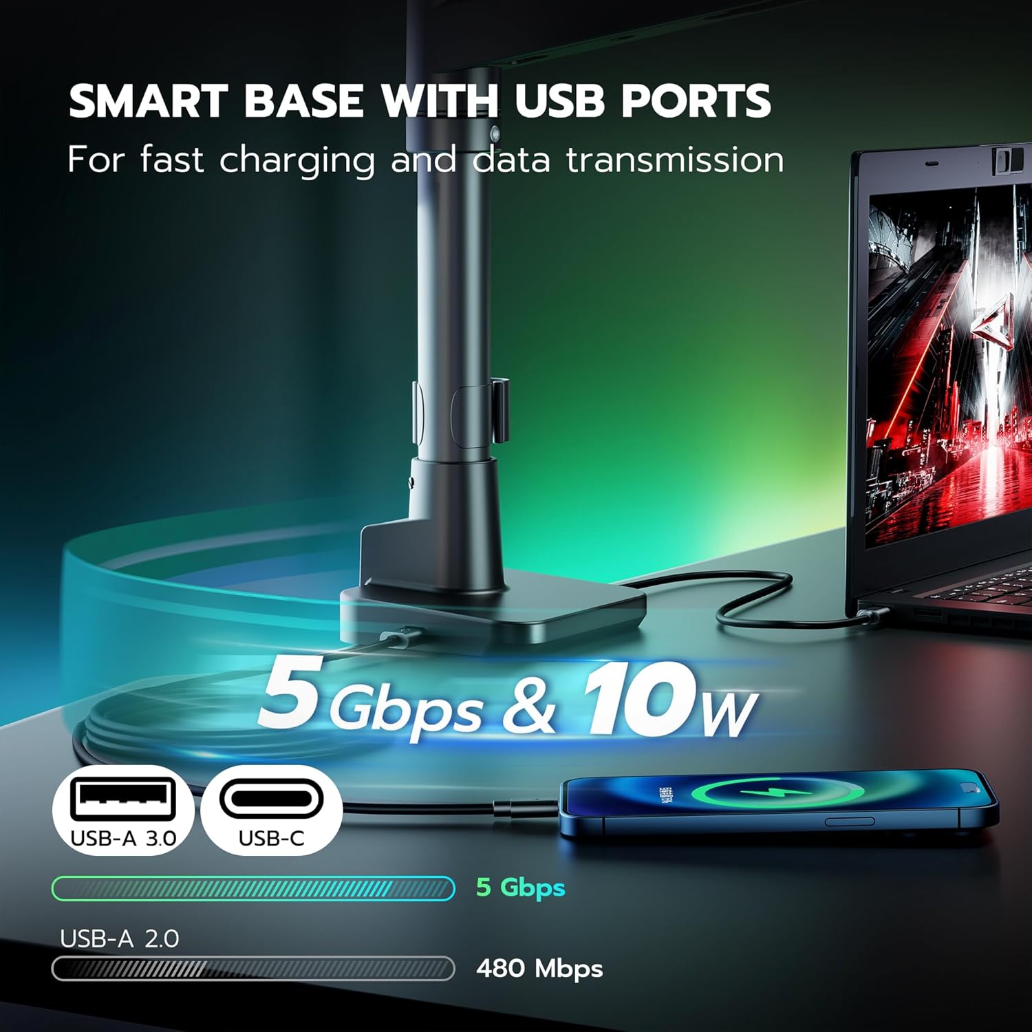 - Smart Base with USB-A/C Ports – Designed to declutter your workspace, this vesa monitor mount not only tackles cable chaos but also frees up over 80% of your desktop area. Equipped with integrated USB 3.0 ports, it offers seamless charging for your smartphones, gaming equipment, and convenient data transfer. By reclaiming valuable desk space, it creates room for your personal gadgets and décor, enhancing both your productivity and workspace aesthetics.