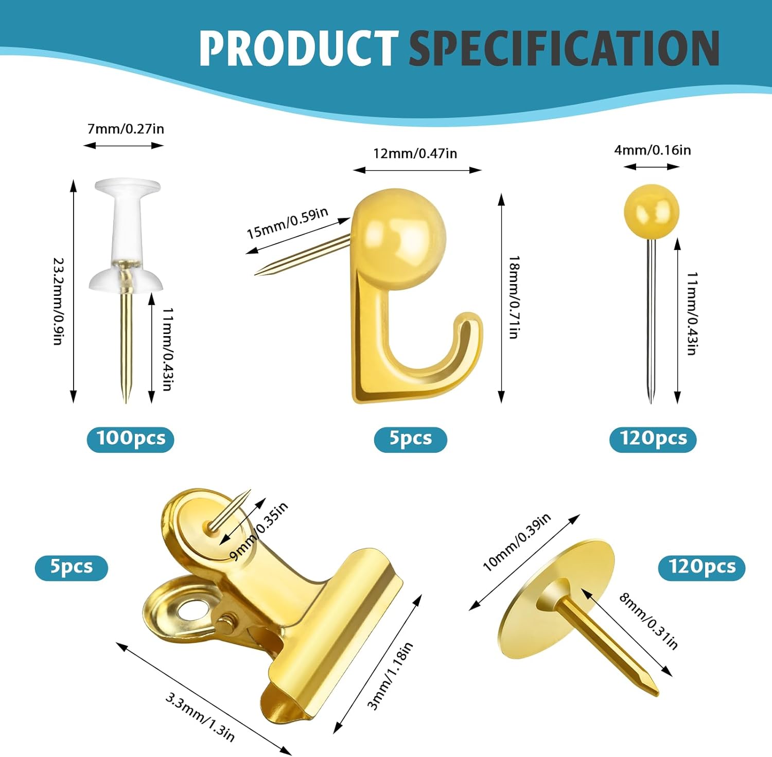 - Package Includes: 350pcs push pins in 5 types, 100pcs clear push pins, 5pcs gold push pin hooks, 120pcs gold map tacks, 5pcs gold push pins clips, 120pcs gold roundness thumb tacks. Each style is placed in a separate compartment for your convenience