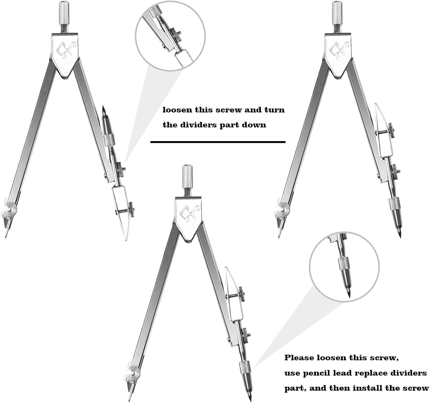 - If you receive the product and found the screw of compass is loose, do not worry, it is not a quality problem; The loose screw makes it easier for you to turn the pencil down; You can tighten the screw after using pencil replace divider part