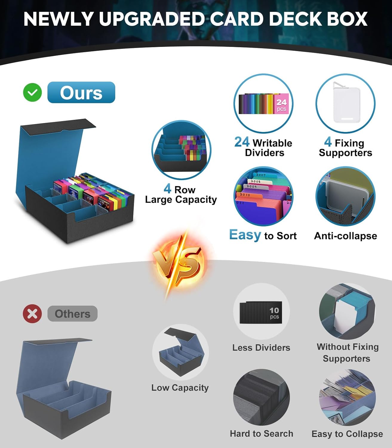 - Upgraded Ultra Capacity Card Deck Box: Our card storage box upgrades 33.3% in capacity from a standard 3-row box to a 4-row box. This TCG deck box can fit 3000+ sleeveless cards, 1800+ single-sleeved cards, or 1500+ double-sleeved cards with ease, excluding top loaders and magnetic holders.
