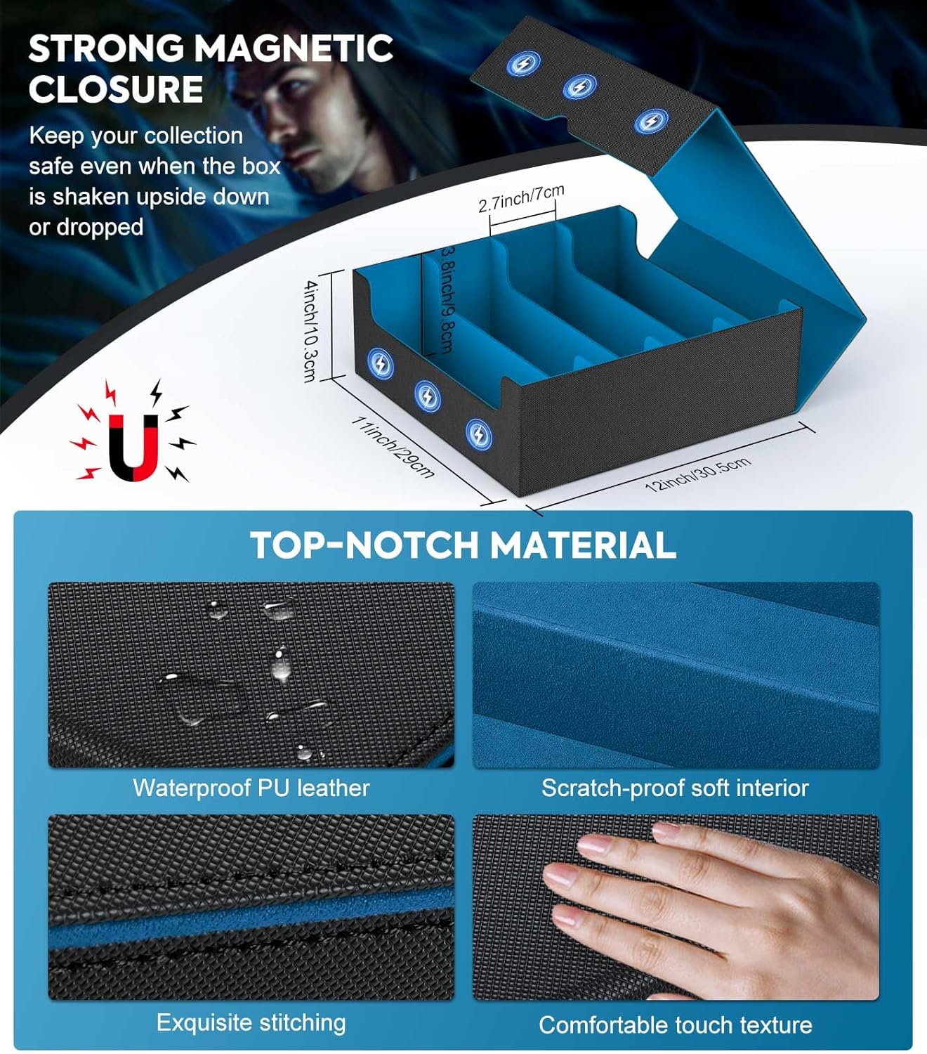 - Premium Material & Magnetic Closure: This large trading card box features a sturdy PU leather shell, waterproof, scratch-resistant, and wear-resistant, offering firmly shock protection. And a soft microfiber interior protects your cards from scratches. Equipped with powerful magnetic closures, providing security for your cards when shipping. It's an ideal choice for deck card players!