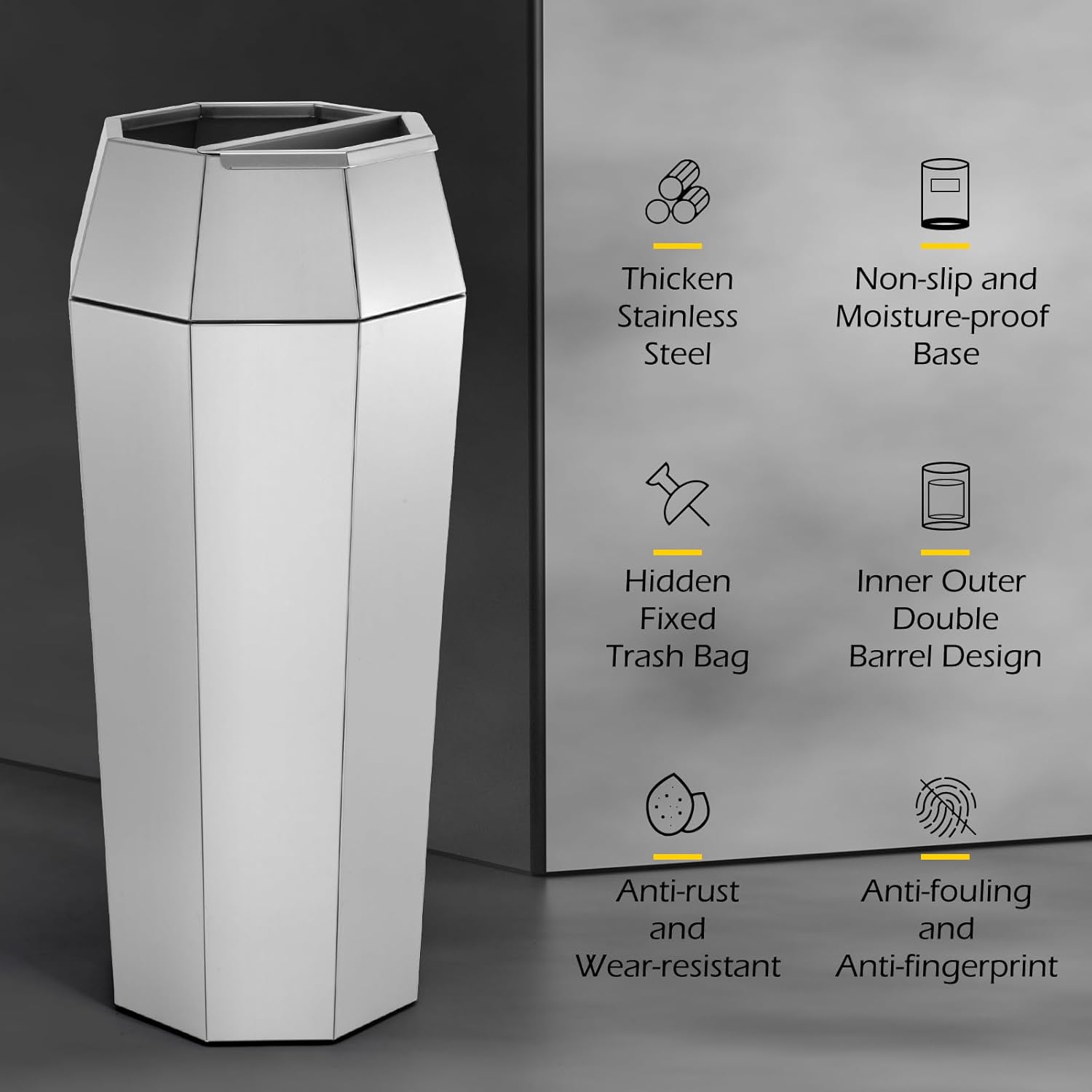 - Large Commercial Stainless Trash Can- Modern silver trash can, open top trash can design, with removable tray, the bottom surface of the trash can with lid is glazed non-slip and moisture-proof treatment. The commercial heavy-duty trash can is widely used in high-end shopping malls, hotels or office buildings.