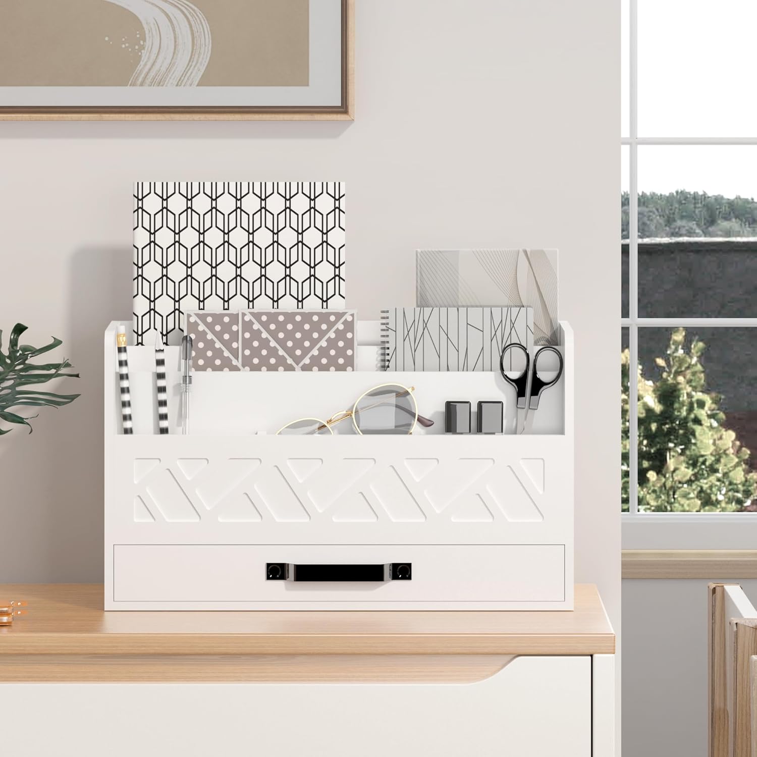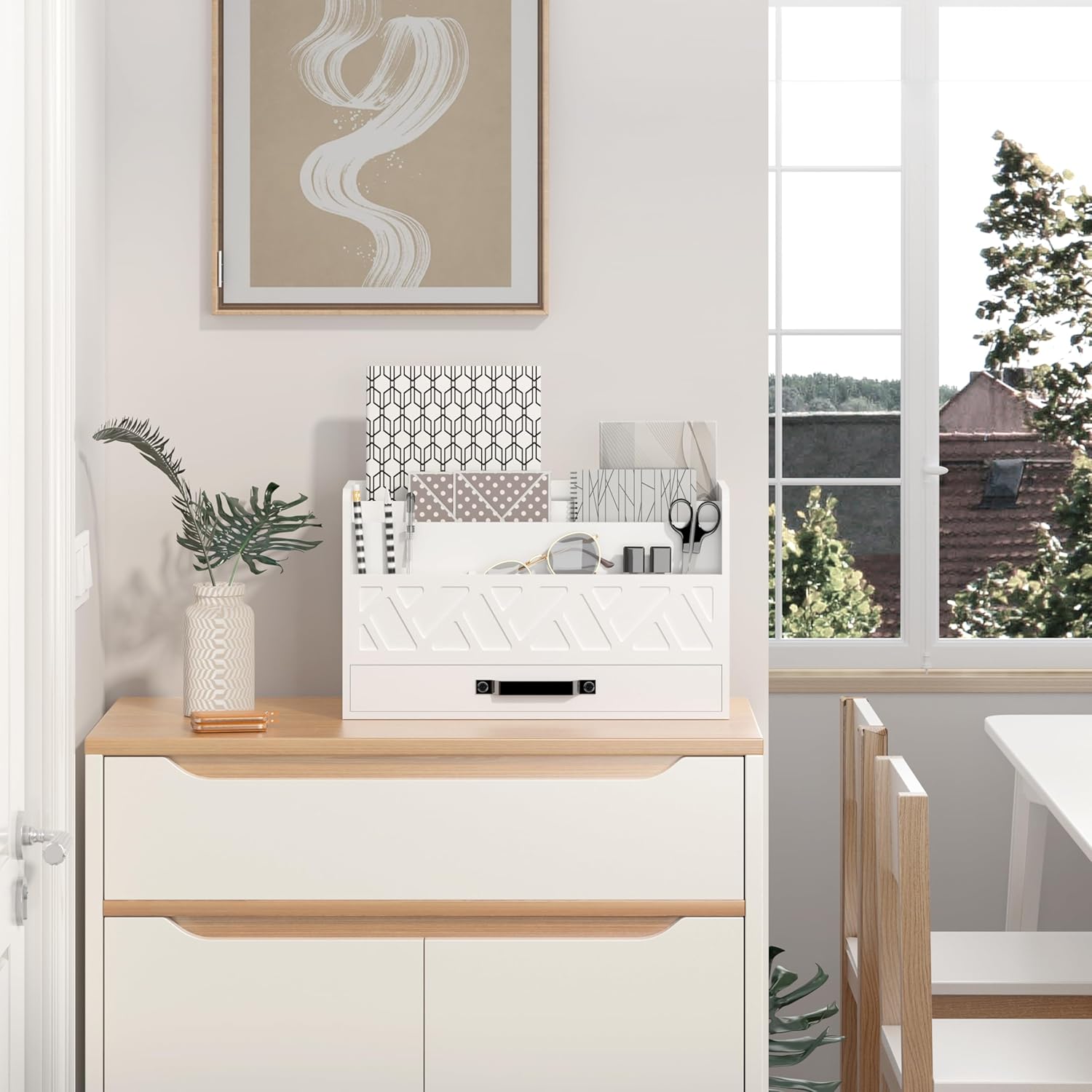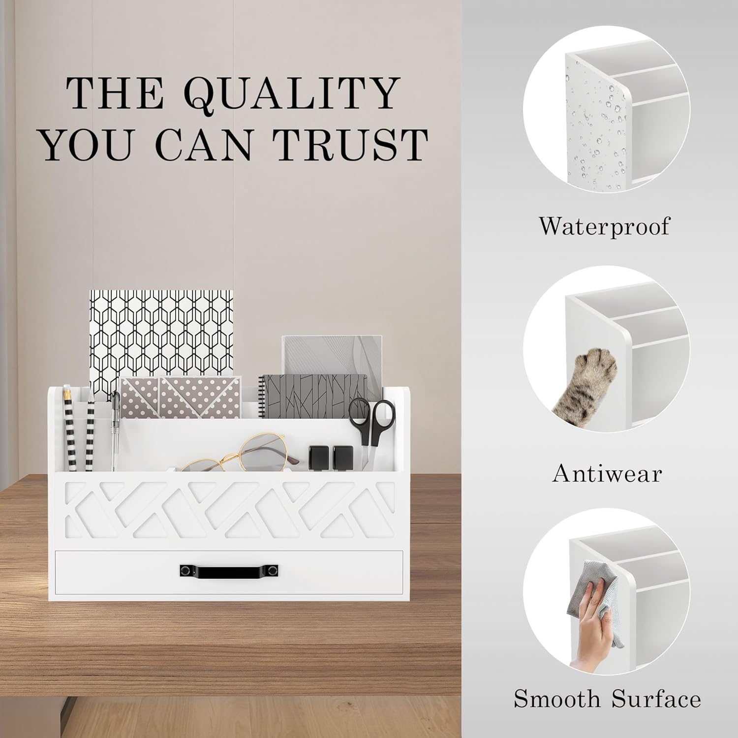Bamboo Mail Organizer Countertop Wood Desk Organizer Drawer Tabletop Storage Box Letter Sorter Makeup Organizer for School Home Office Supplies White
