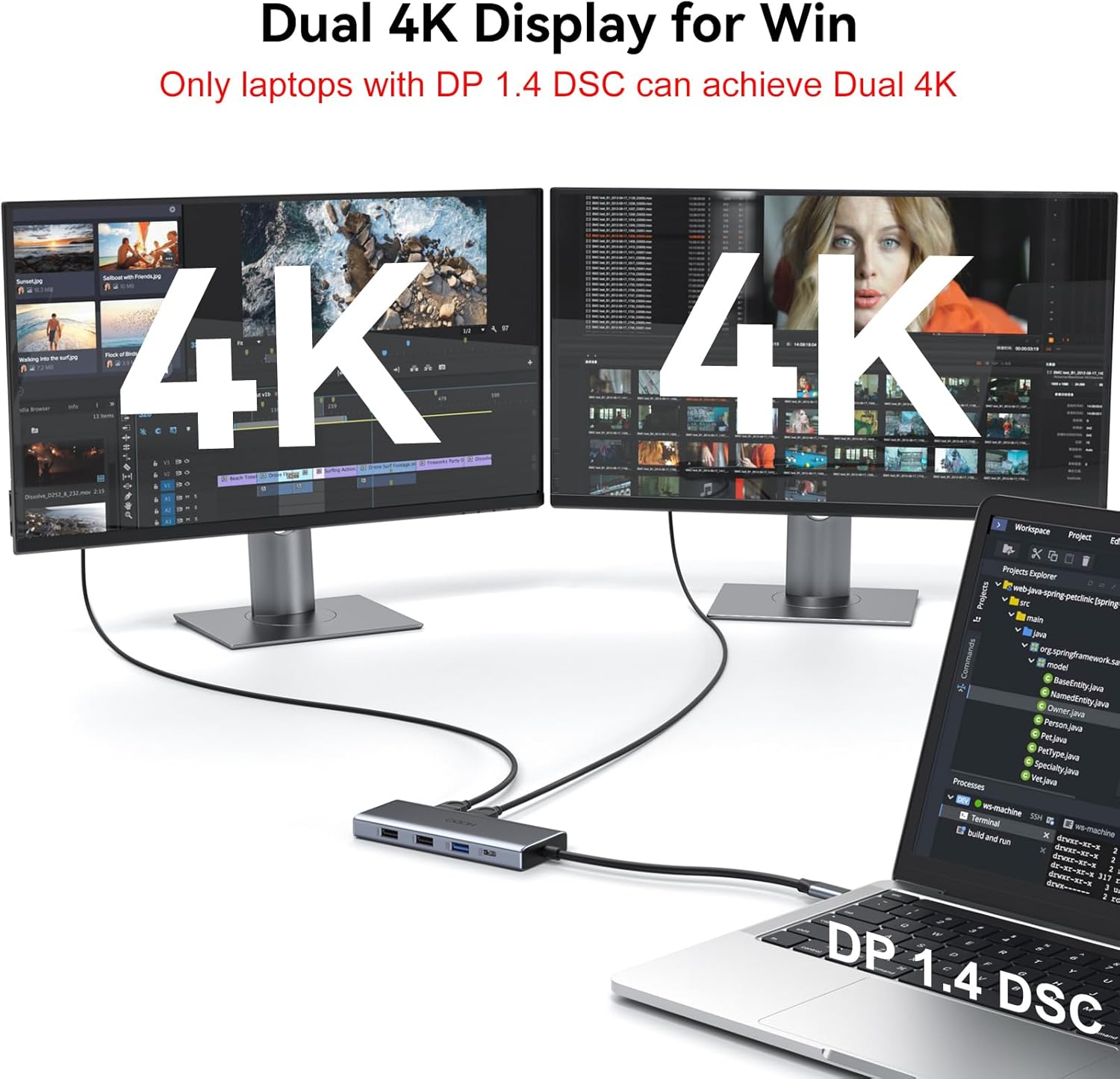 - Laptop Docking Station 4K Display Adapter: The USB C Docking Station Dual HDMI Splitter with 4 video output ports: 2 HDMI+DP+VGA. For single display, HDMI can reach 8K@30HZ or 4K@144HZ; For dual display and triple display, Can output up to 4K Dual/Triple Display videos(For laptop with DP 1.4 DSC); For quadruple display, Dual HDMI, DP, and VGA all are 1080@60Hz. Please make sure your laptop specification support DP1.4 signal output. If the VGA port is connected, it will affect the resolution of all displays up to 1080P only