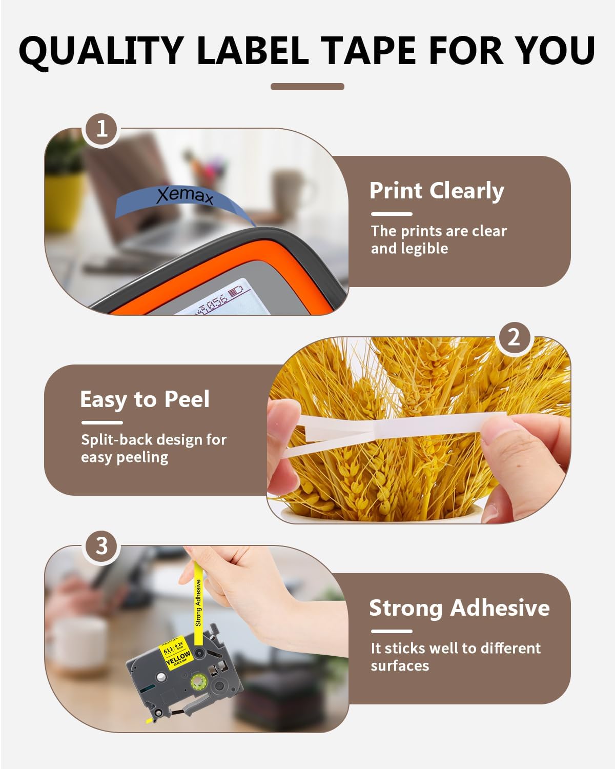 - Features: (1) Tze Tz Tape 6mm 0.23" Laminated White Label has strong adhesive, and no sticky residue when you remove the labels. (2) Split-back for easy to peel and apply. (3) These p touch label tapes are Water Resistant, Chemical Resistant, Abrasion Resistant, Fade Resistant, Temperature Resistant, and Print clear