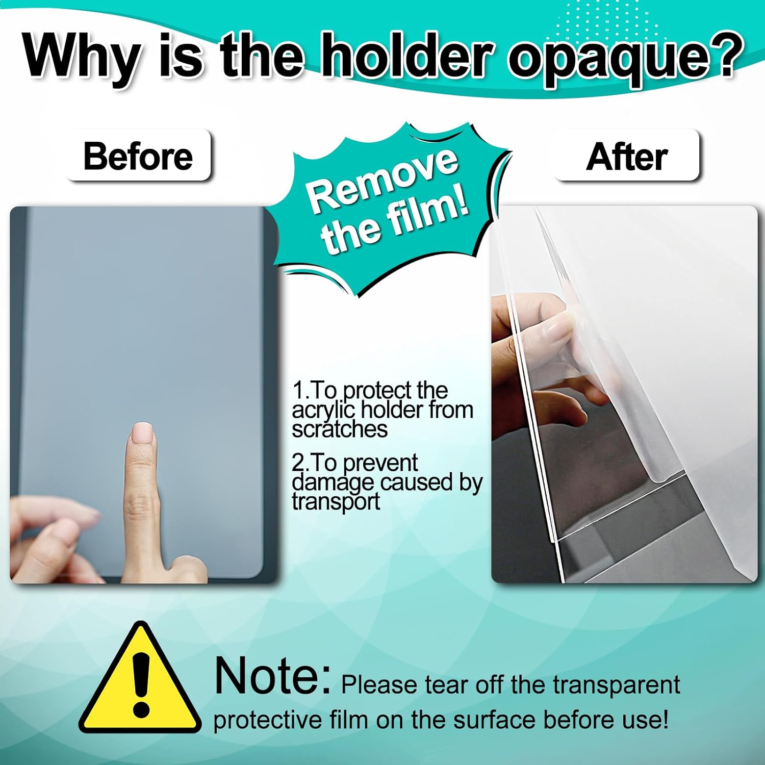 - Tips: The surface of the clear sign holders 8.5 x 11 wall mount you received does not look transparent because we have covered a layer of protective film on the surface of the clear picture frame, you just need to tear off the protective film to get a transparent acrylic wall frame. If there is any damage please feel free to contact me, I will provide you with a satisfactory solution within 24 hours.