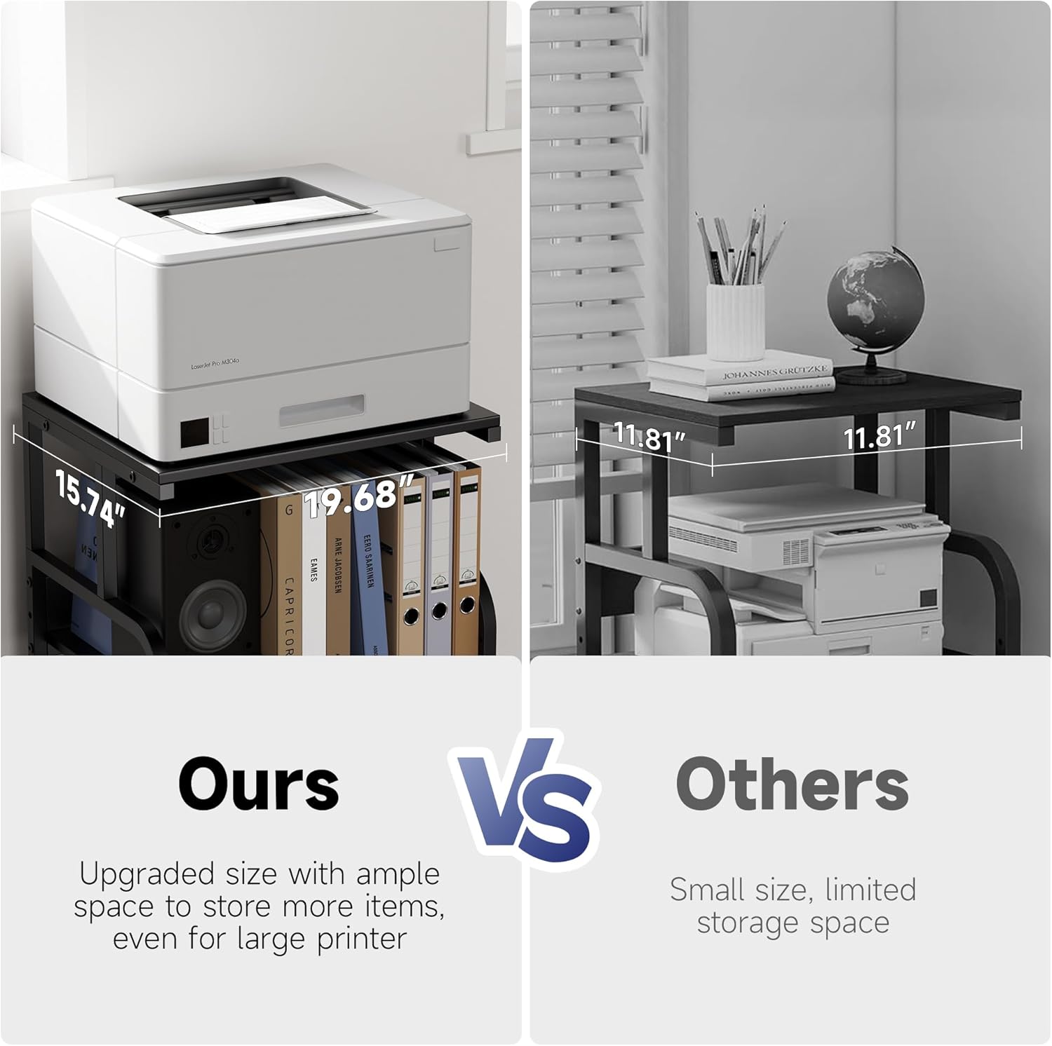 - 【Customizable Height for Versatile Storage】 Transform your compact workspace with 5-level adjustable height (9.45" range) on the middle shelf! Perfectly adapt for bulky laser printers, 3D printer stands, or mini fridge stands by tailoring tier spacing. Measuring 19.68”Wx15.75”Dx27.55”H, this space-saving printer table for home office maximizes vertical storage without sacrificing mobility. Industrial steel frame and 110 lb/shelf capacity ensure wobble-free stability even during high-volume printing. Optimize tight spaces as a mobile printer cart or under desk printer stand!