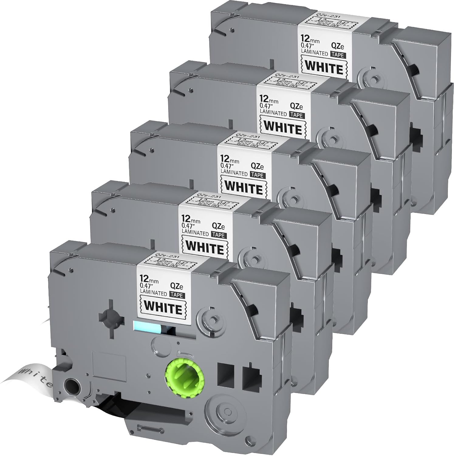 5Pack TZe-231 Tape Label Maker Compatible with Brother P-Touch TZe-231 Tape, TZE231 ½” 0.47”x 26.2 ft Laminated Black on White, for use with PT-D210, PT-H110, PT-D220, PT-D410, PT-D600