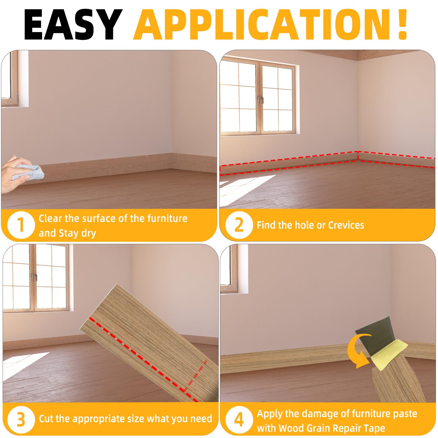 - High Quality - The Wood Grain Repair Tape is made of high quality Self Adhesive, which is durable and elastic, with a smooth surface and not easy to be dirty.When you repair Tables, Chairs, Baseboards, Doors, Windows, Floors, All Kinds of Furniture Renovation, Wood Grain Repair Tape will be your first choice