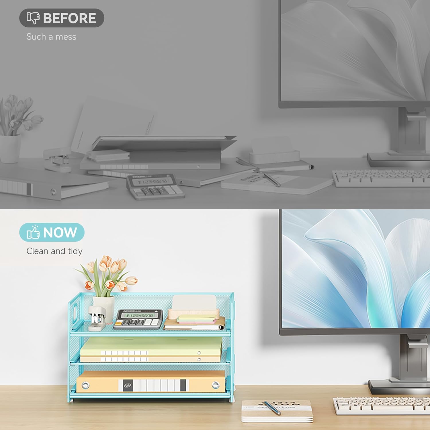 Subekyu 3 Tier Paper Desk Organizer with Handle and 1 PC Slideable Letter Tray, A4 Paper File Folder Sorter Metal Mesh Organizer for Home Office School Desk Supplies Organization Storage, Blue