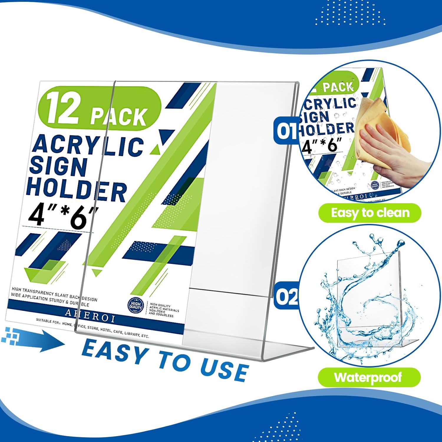 Aheroi 12Pcs Acrylic Sign Holder, 4x6 Clear Sign holders Paper Stand, L-shape Table Sign Holders Plastic Sign Holder Standing, Paper Display Stand for Menu Document Holder Office Desktop