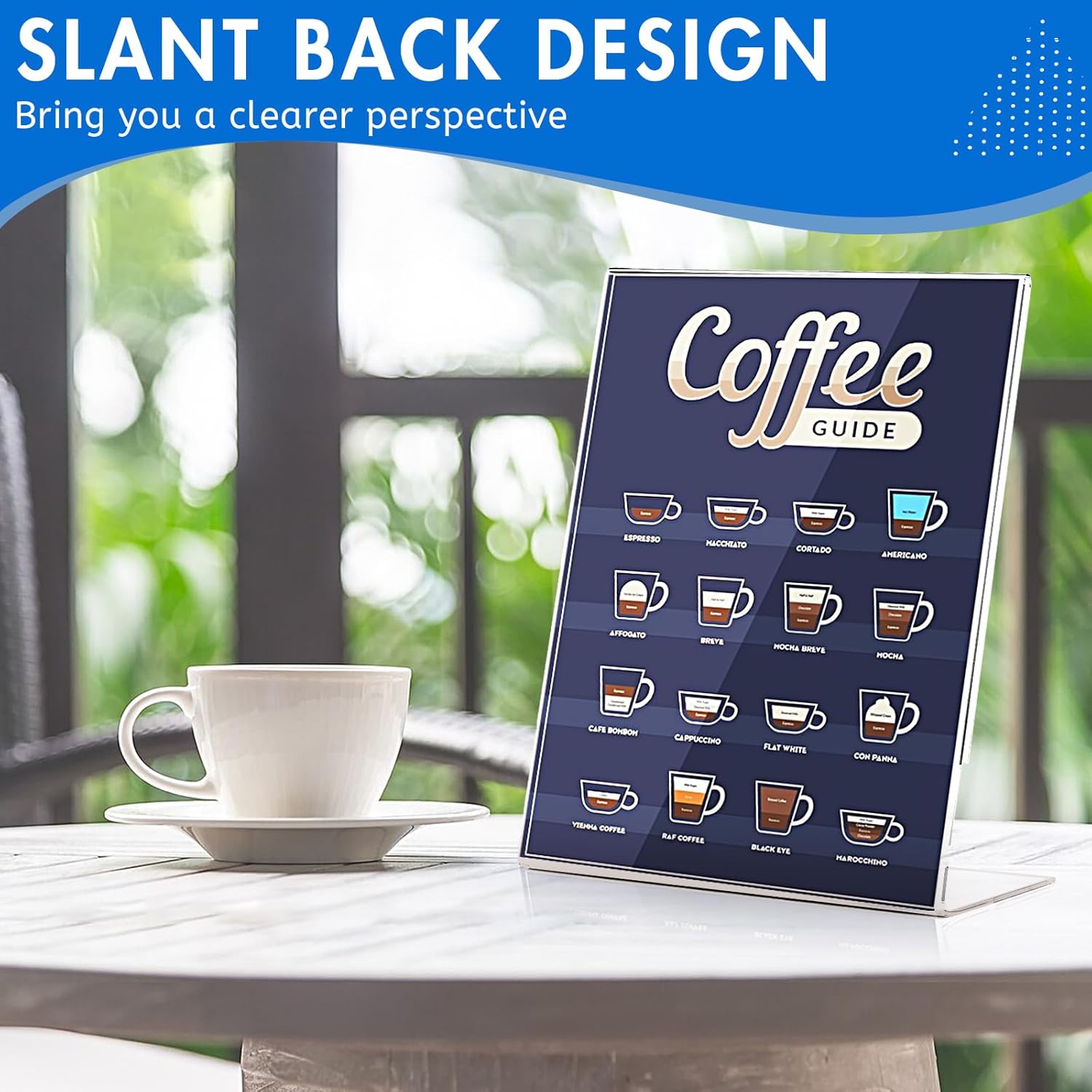 - Slant Back Design: The acrylic sign holders are designed with a slant back and tilts at a perfect angle to display the information on the paper, whether it's a guideline message or a dish. The bottom of the plastic frames for display is supported by an anti-tilt base for stability. Note: In order to ensure that you receive the most perfect plastic sign holder 8.5 x 11 standing, we have attached a protective film on the surface of each sign holder, please remove the film before use