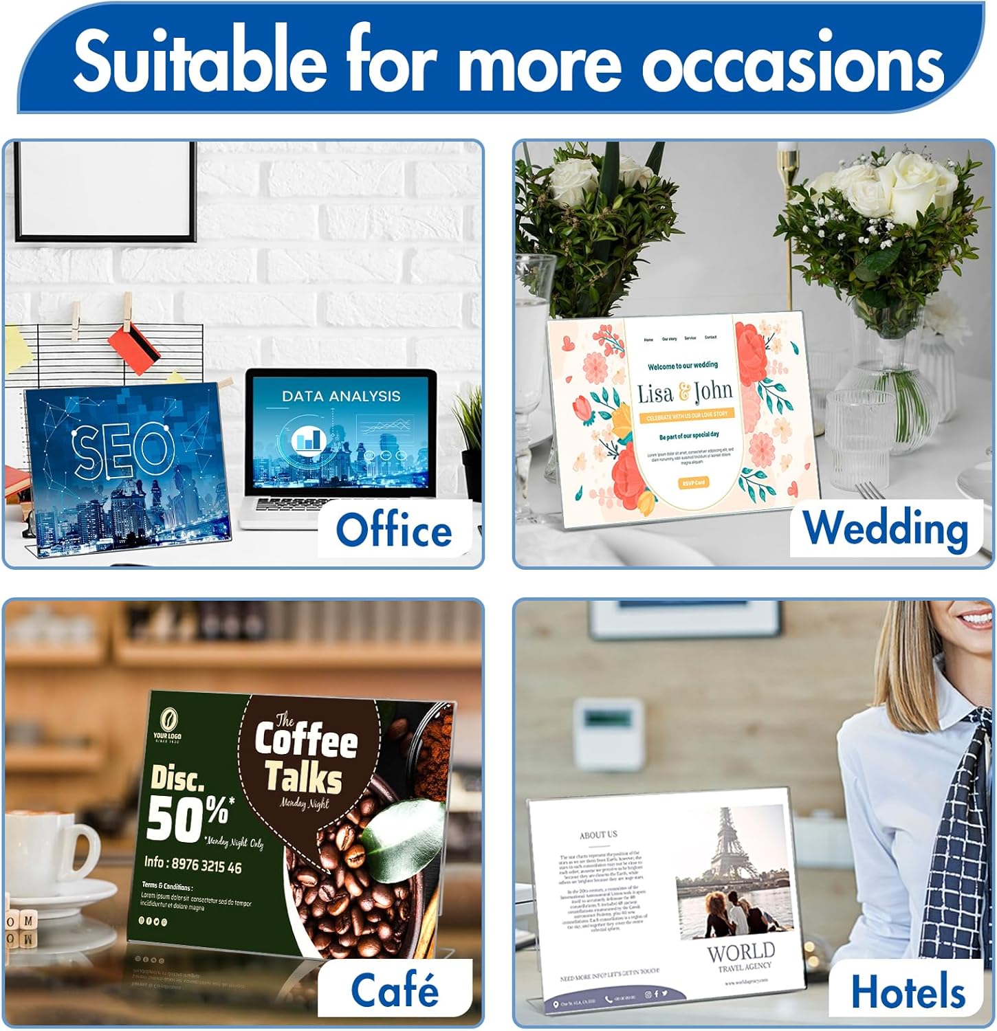 - Widely Used: The clear picture stands for display has a minimalist design and a stylish and practical style. Whether it's a serious office or a festive wedding, it's a perfect fit. Suitable for various occasions such as wedding table list display, dining table number placement, cafe or restaurant menu display, hotel front desk guidance, office daily file use and so on
