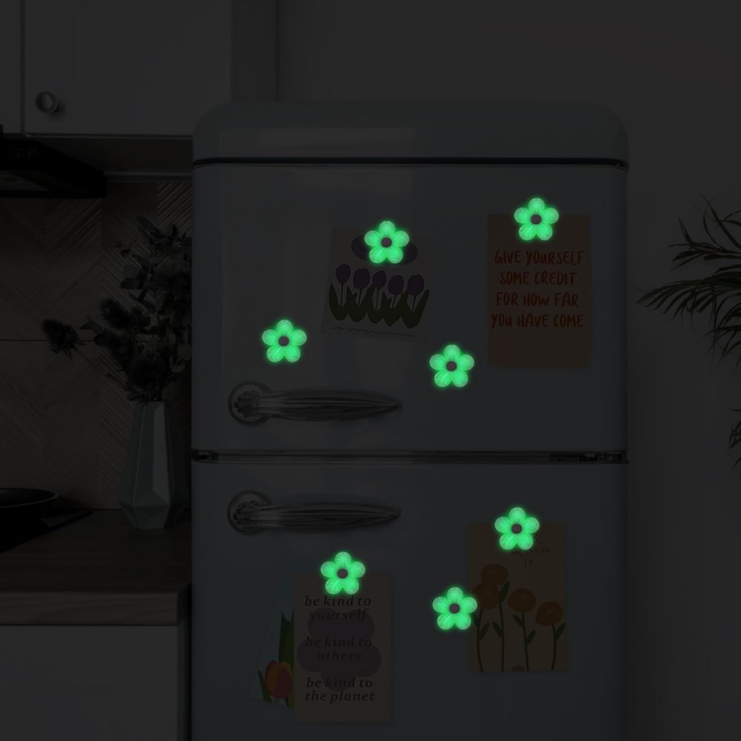- Bright Glow in the Dar: These flower magnets glow vividly in the dark after just 30 minutes of charging under bright light—UV light sources like sunlight or black light work even faster. The glow starts bright and gradually fades, creating a magical night-time effect. Recharge anytime with light for long-lasting, reusable illumination.