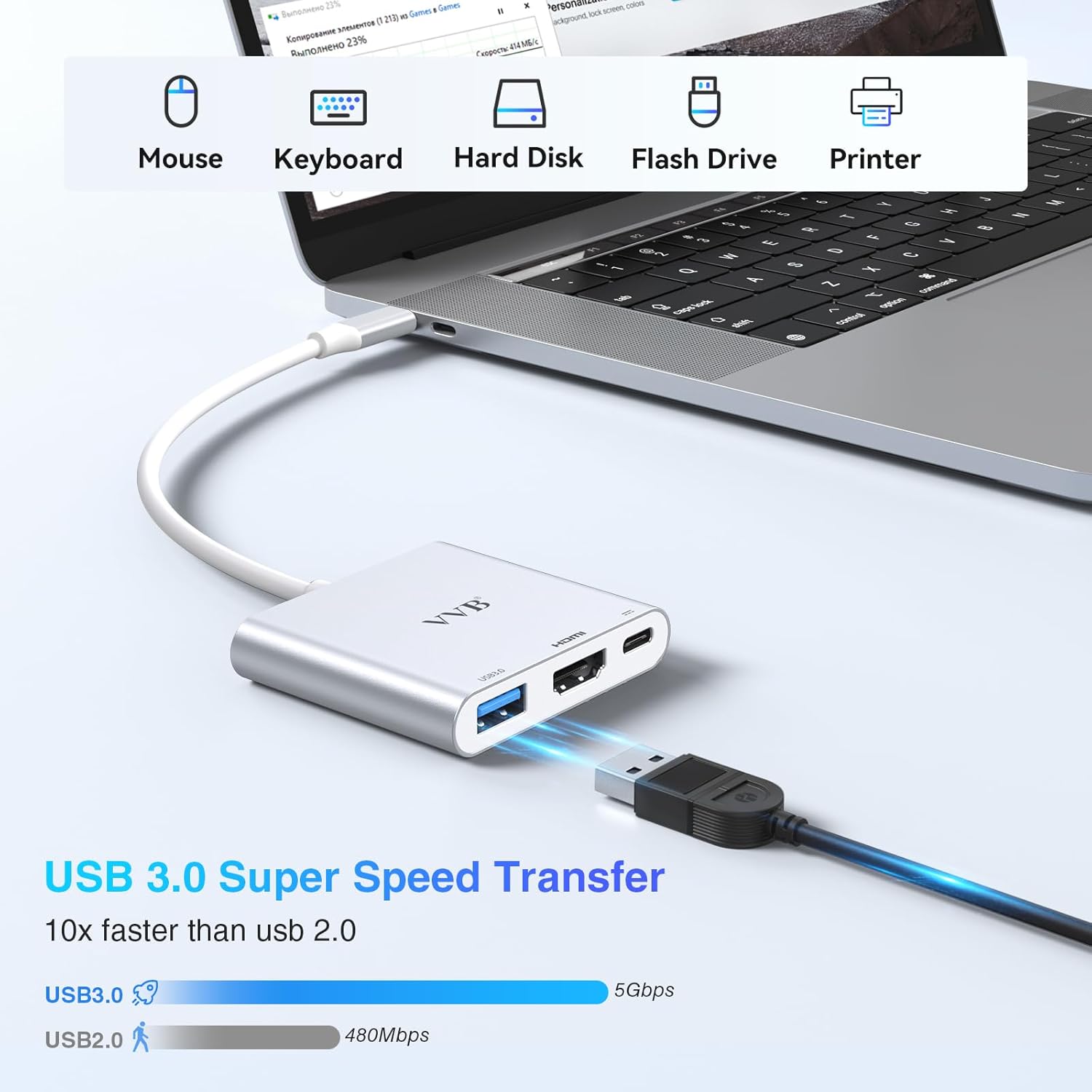 - USB C to HDMI Adapter 3-IN-1: This multiport digital AV converter expand laptop USB type-C port into 4K@30Hz HDMI output port, a PD charging port (Charging function only), and a USB-A 3.0 port. Universal usb 3.0 multiport adapter convenient for home-theater entertainment,exhibition,optimizing office productivity etc