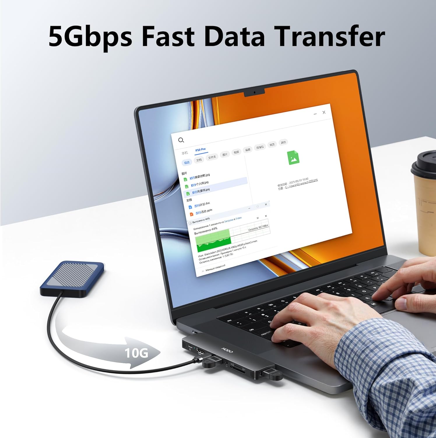 - Dual USB C Female Port: The first usb c port is a original thunderbolt 3 port like the macbook itself which support data transfer up to 40Gbp/s, up to 5K display and up to 100W power; Another usbc port is a data transfer port which speed can up to 5Gbps, a best port for USB C Device like ssd hdd,etc. Notice: The second usb c port of this usb c hub doesn't support HDMI output and charging function