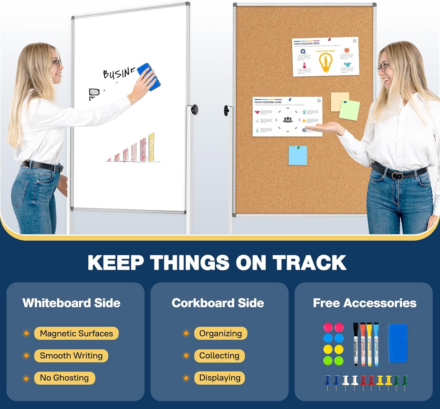 - Standing Double-Sided Board Combo - Compared to wall-mounted boards, this double-sided boards combination offers a compact footprint of just 4.2 sq/ft, while providing a generous 15.5 sq/ft of total available space. One side features a whiteboard for writing, and the other a cork board for pinning, offering versatile functionality