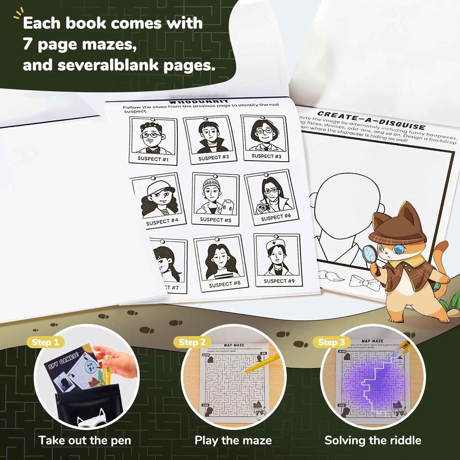 - Invisible Ink Pen and Notebook: 6 invisible ink pens with UV light + 6 spy game notebooks(5.08in x 3.7 in),each book comes 7 mazes problems and blank papers