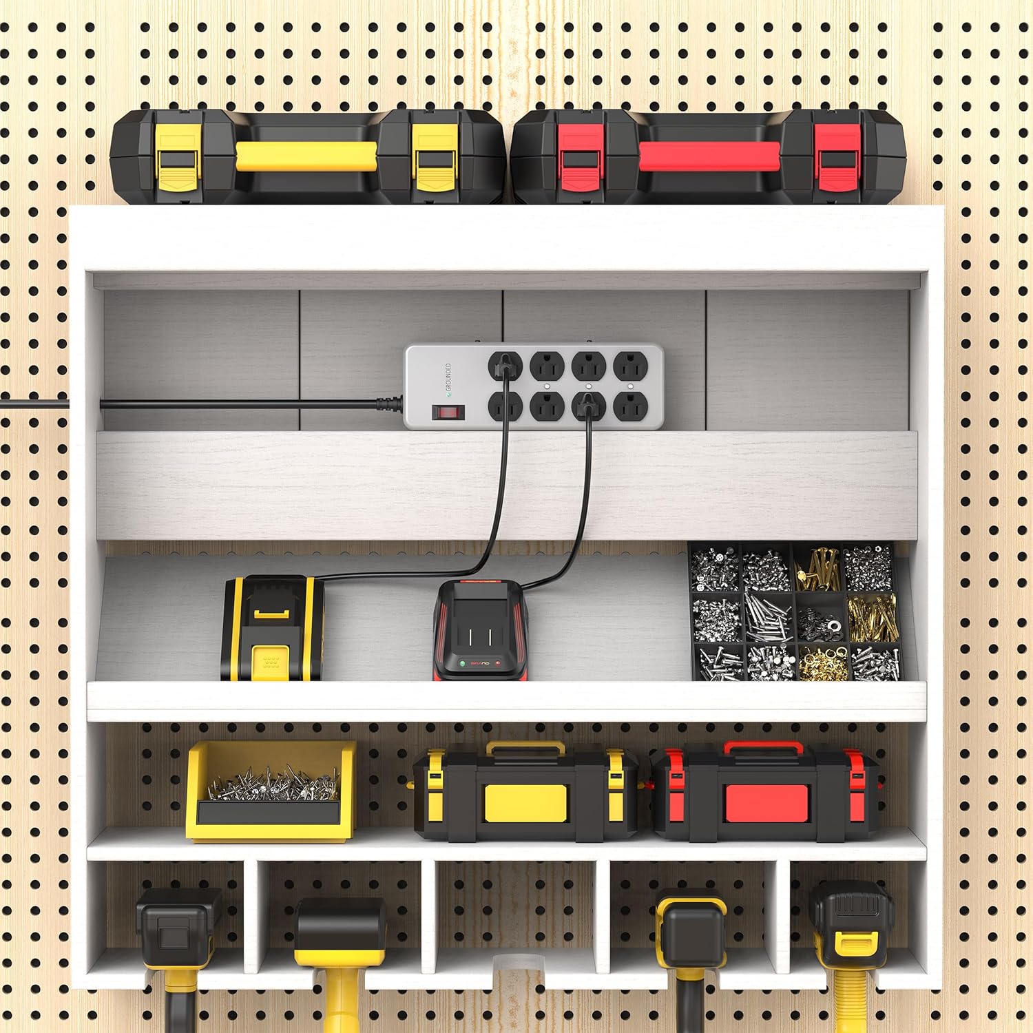 - Effortless Installation and Storage: This wall mountable power strip with switches features a hanging hole design, making it super convenient for any workspace. Use the hanging hole for storage addresses the need for a workbench or garage power strip wall mount, ensuring a tidy and accessible work area.