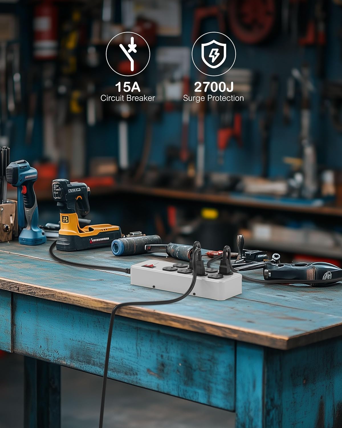 - Comprehensive Protection: this outdoor surge protector delivers 2700 Joules of protection and a 15Amp circuit breaker, ensuring your equipment remains safe from unexpected power spikes. The industrial-grade shop power strip is not just a device; it's a safeguard for all your electrical applications.