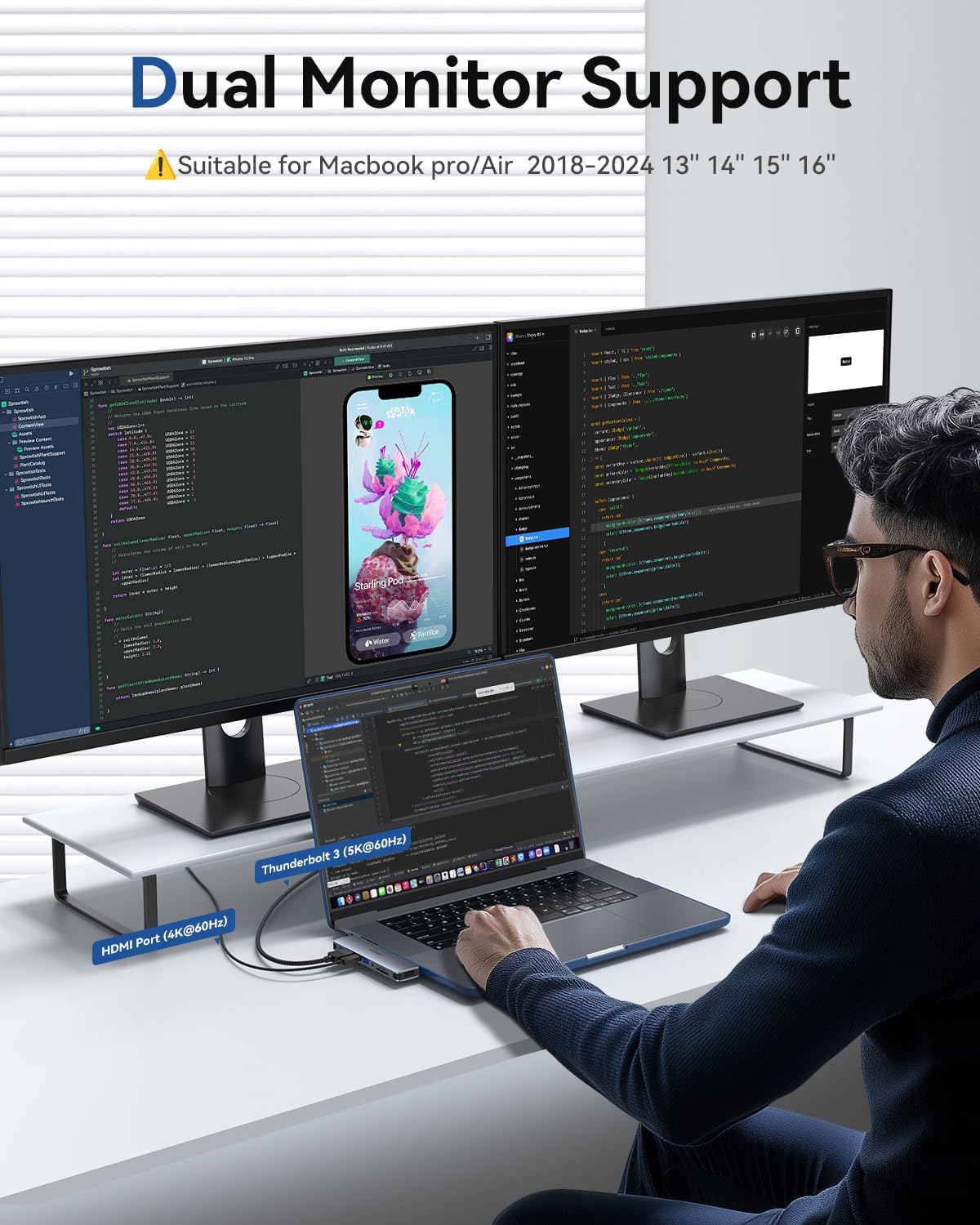 - HD Crystal-like Picture Quality: By connecting the HDMI (4K@60Hz) and Thunderbolt 3 (5K@60Hz) ports of this macbook hub, it brings you an ultra-high-definition visual feast. You can realize HD dual monitors with 4K HD picture quality and 5K brings 3D effect as if you are in the real world. You can extend two different monitors at the same time through this macbook accessories (mirroring or expansion mode), and even extend the picture to the TV or projector outside the monitor, so you can work efficiently, but also can't better relax and enjoy life. Note: MacBook models with the M1, M2, or M3 chip do not support dual external displays at the same time