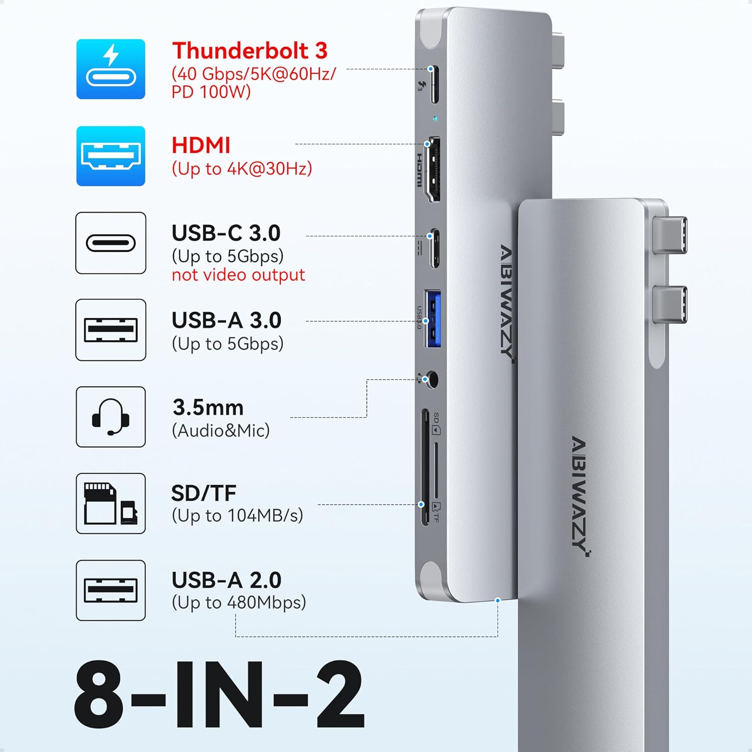 - Enhanced Connectivity with 4K HDMI and 5K Thunderbolt 3 MacBook Hub: Elevate your MacBook experience with our versatile USB C Hub. Enjoy stunning 4K resolution at 30Hz through the HDMI port and immersive 5K visuals at 60Hz via the Thunderbolt 3 port. Achieve Dual Monitor Display effortlessly—mirror or extend your laptop screen to TVs, monitors, or projectors. Note: MacBook models with M1, M2, or M3 chips do not support dual external monitors simultaneously