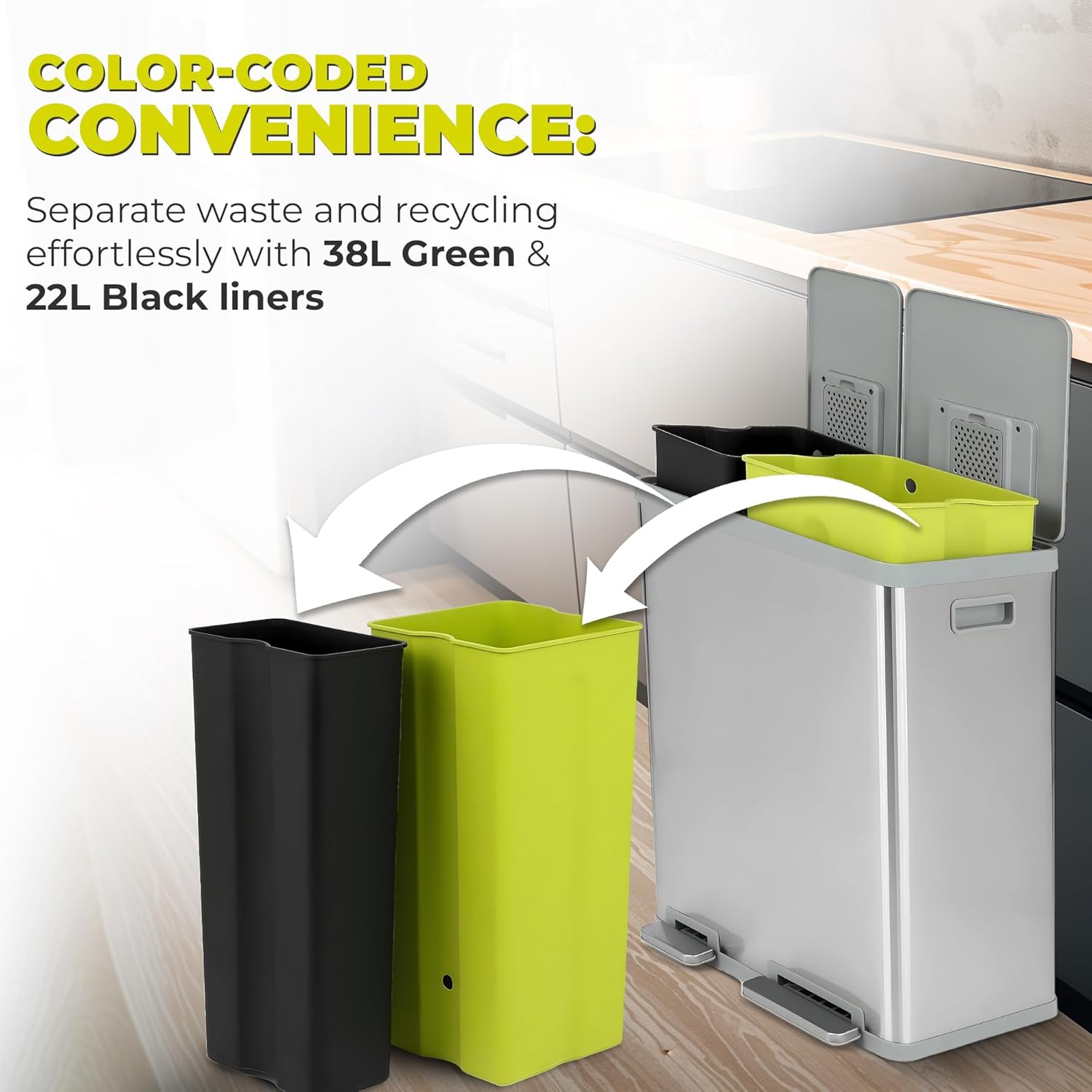 - HIGH CAPACITY WASTE AND RECYCLING SOLUTION: Color coded liners in Green (38L) and Black (22L) allow for easy sortation of waste and recycling, without sacrificing waste capacity, and fit standard liners using bag cinch.