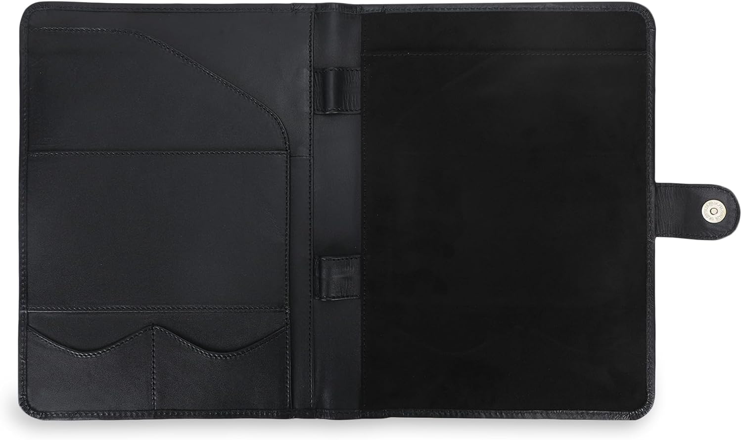 - SMART STORAGE SPACE - Compact design ensures plenty of storage space for all your work needs. Store your Letter-Size or A4 refillable notepad in the right side, with one main opening for filing sheets, one medium pouch for smaller documents, and 2 v-shaped pockets for business cards on the left side. Additionally, there are 2 leather pen holder loops.