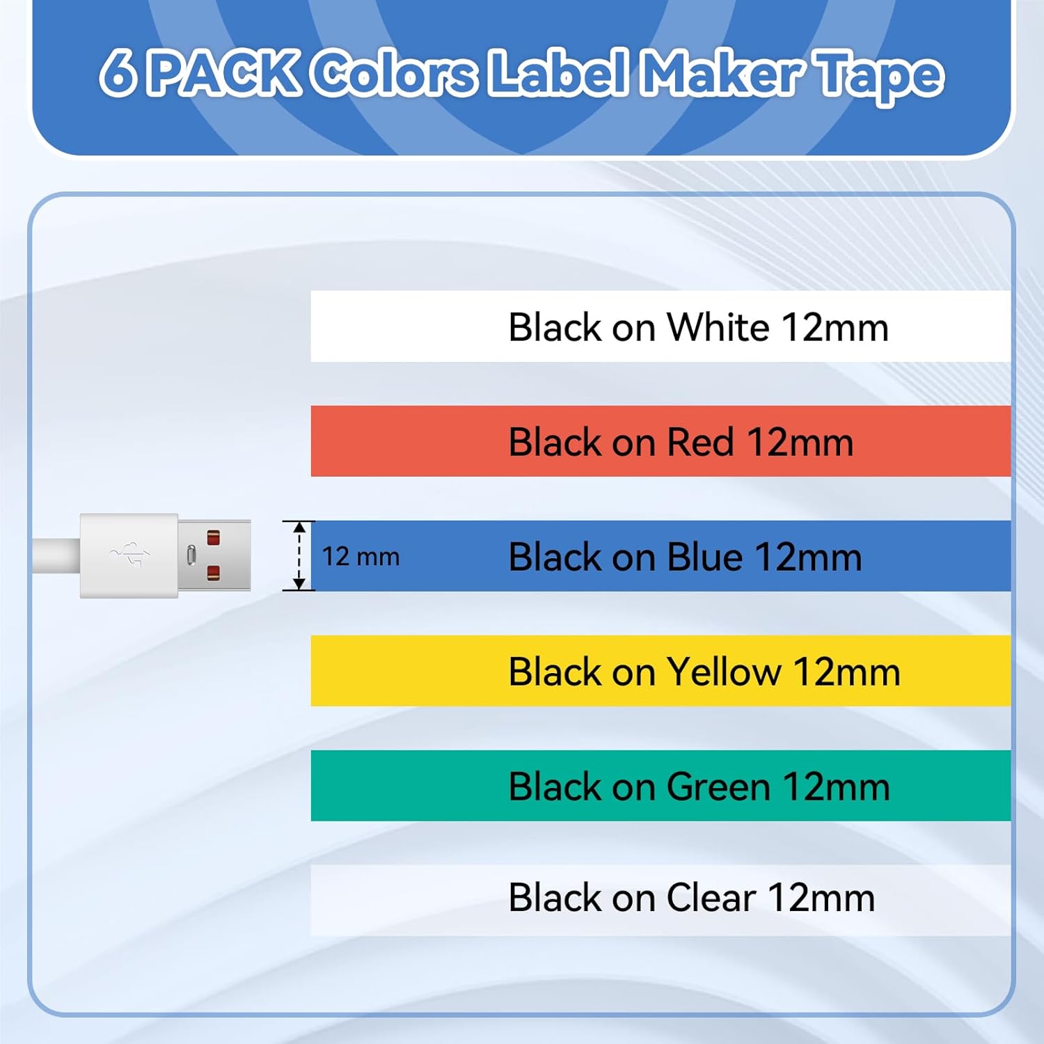 Label Maker Tape Colored Refill Compatible with Brother P-Touch Label Tape TZe 12mm 0.47 Ribbon Laminated TZ Colored Refills TZe-231 for PT-D210 D220 H110 D410 P710BT H111 1070 1880, 6-Pack
