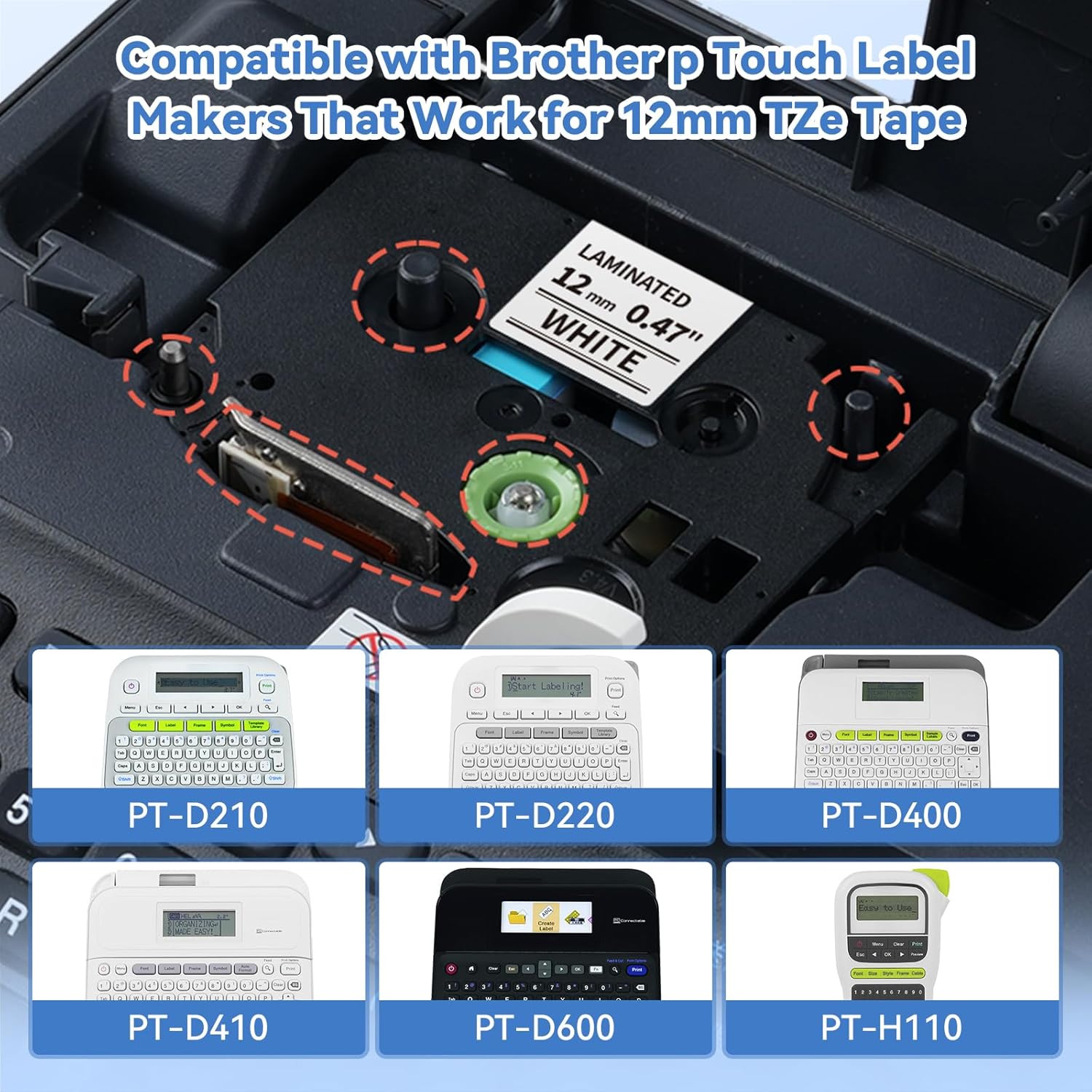 - 【Replaced for Brother P Touch Pth110 Tape Color Durable and Non-fading】 Tz tape white on color and Compatible with Brother label maker tape color won't fade even when exposed to sunlight, won't flake or curl over time. Tz tape 12mm white strong adhesion, water withstand, wear withstand, corrosion withstand, high and low temperature withstand, grease withstand