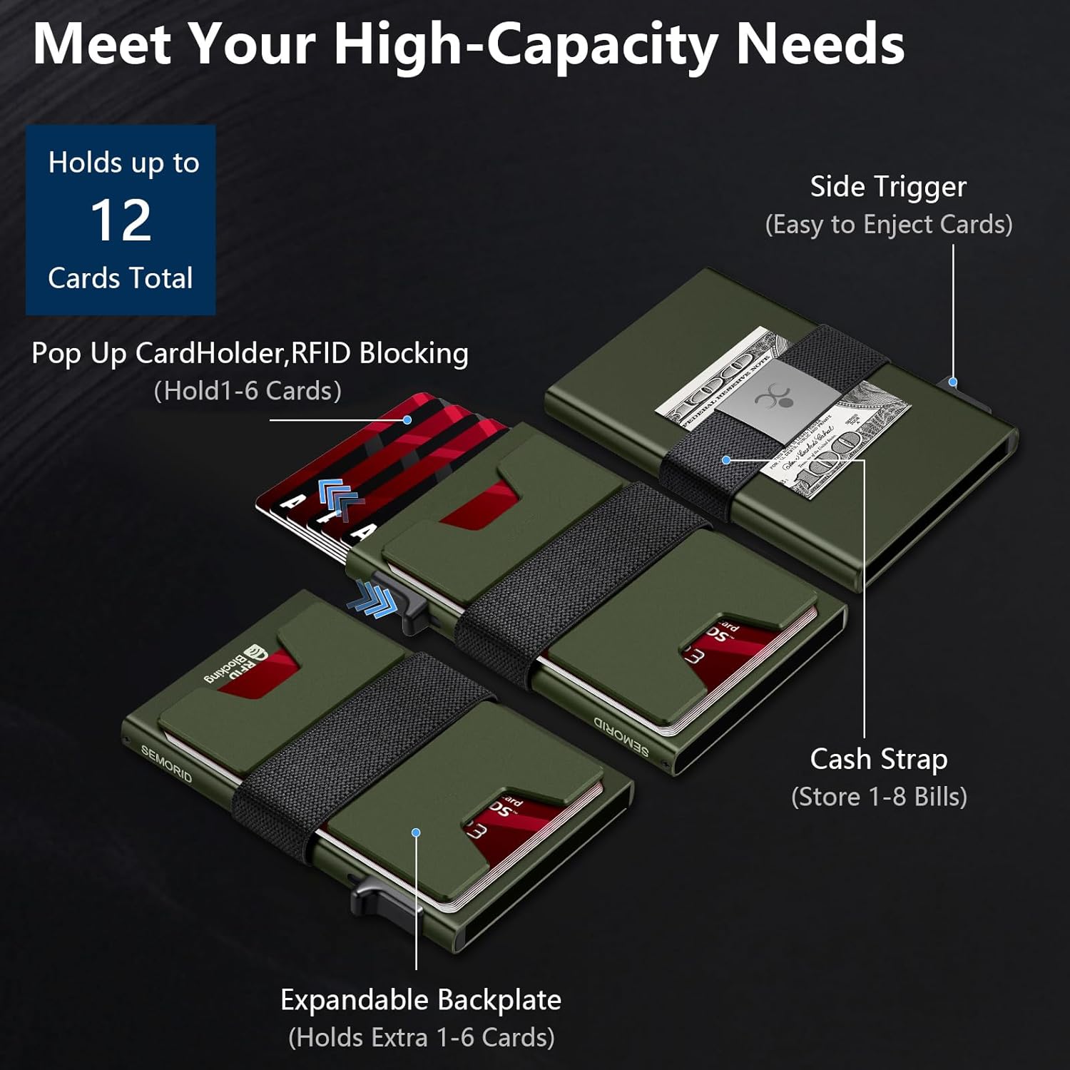 - π³ QUICK ACCESS & LARGE CAPACITY HOLD UP 1-12 CARDS: This mens wallet designed with enhanced enjection mechanism button to pop up cards quickly. The aluminum card holder holds 4-6, depends on the number of embossed cards, and the expandable metal backplate holds 5-6 additional cards. The actual capacity depends on the card thickness.