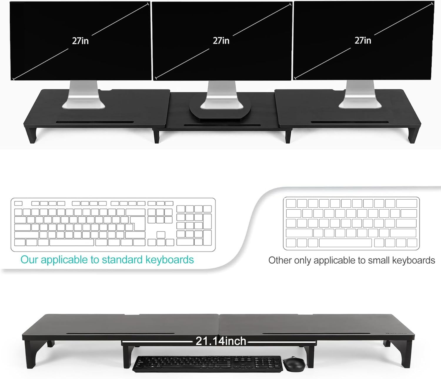 - 【Triple Monitor Stand for Desk】The three monitor stand is built up with 3 shelves, which can hold three 27" computer monitor(please refer to picture 4).Much space is available for matching multiple devices - PC/laptop/printer/books.You can also set up the desk as your need. The height of this black monitor stand is about 4in (the other black monitor stand is about 3.1in )