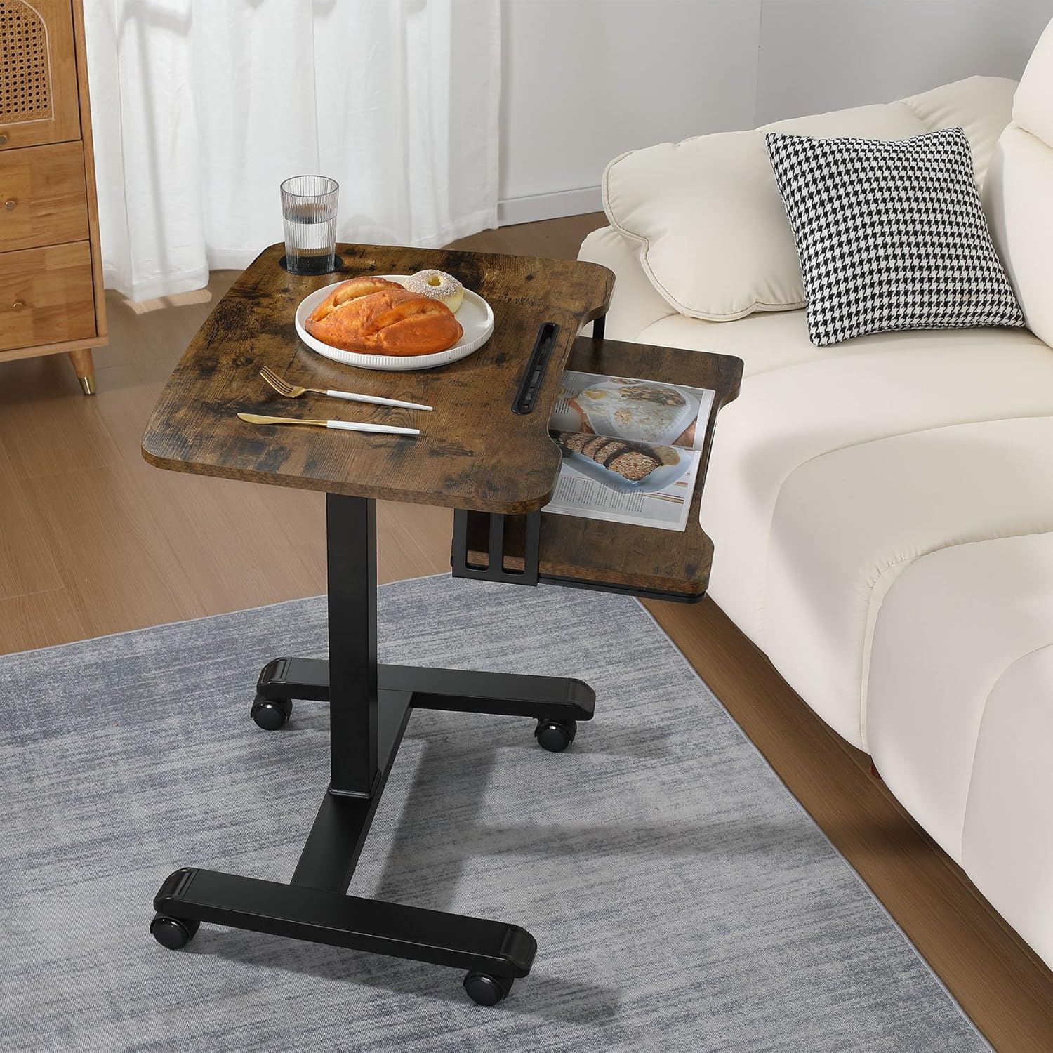 - 【Versatile Mobile Standing Desk with Keyboard Tray】 This rolling desk combines portability and functionality, featuring a spacious 23.6 x 11.8 keyboard tray to comfortably fit a full-size keyboard and mouse. The built-in desk drawer offers extra storage, while the marbled wood tabletop (26.7L x 19.6W) includes a cup holder and 0.9 slot for organizing drinks, phones, or tablets.